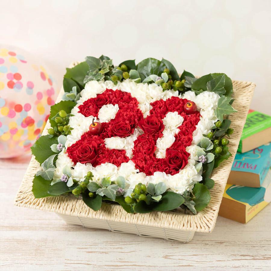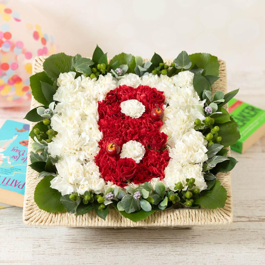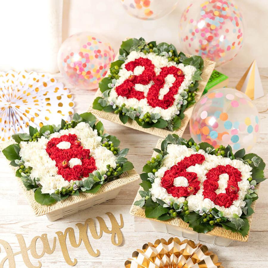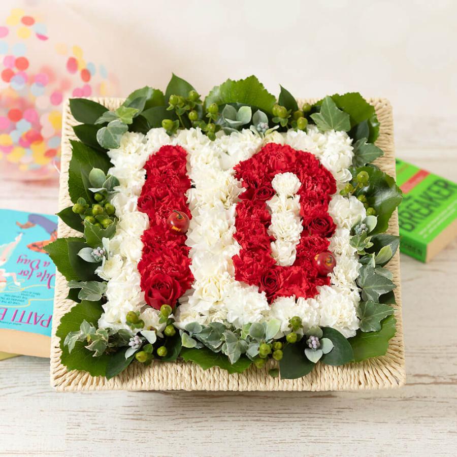 お誕生日、結婚記念日、開店お祝い…”メモリアル・ナンバー”を贈ってみませんか?還暦のお祝いには60、錫婚式(結婚10周年)には10…等、数字のバリエーションをご用意しました。祝い事に伝統的に使われる紅白2色の花々で彩られ、両手に抱えるほどたっぷりとしたアレンジメントは、飾るだけでお祝いの席を華やかに彩ります。頂いた方も思わず写真を撮りたくなるような記憶に残る特別な贈り物です。これまでの愛おしい日々や、これからの輝かしい未来を祝って贈ってみてはいかがでしょうか。※お水を抜いた場合は、少し立てかける事も可能です。"}