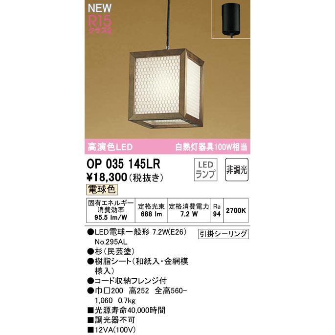 OP035145LR LED和風ペンダントライト 白熱灯器具100W相当 R15高演色 クラス2 電球色 非調光 電気工事不要 オーデリック 照明器具