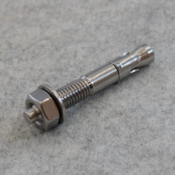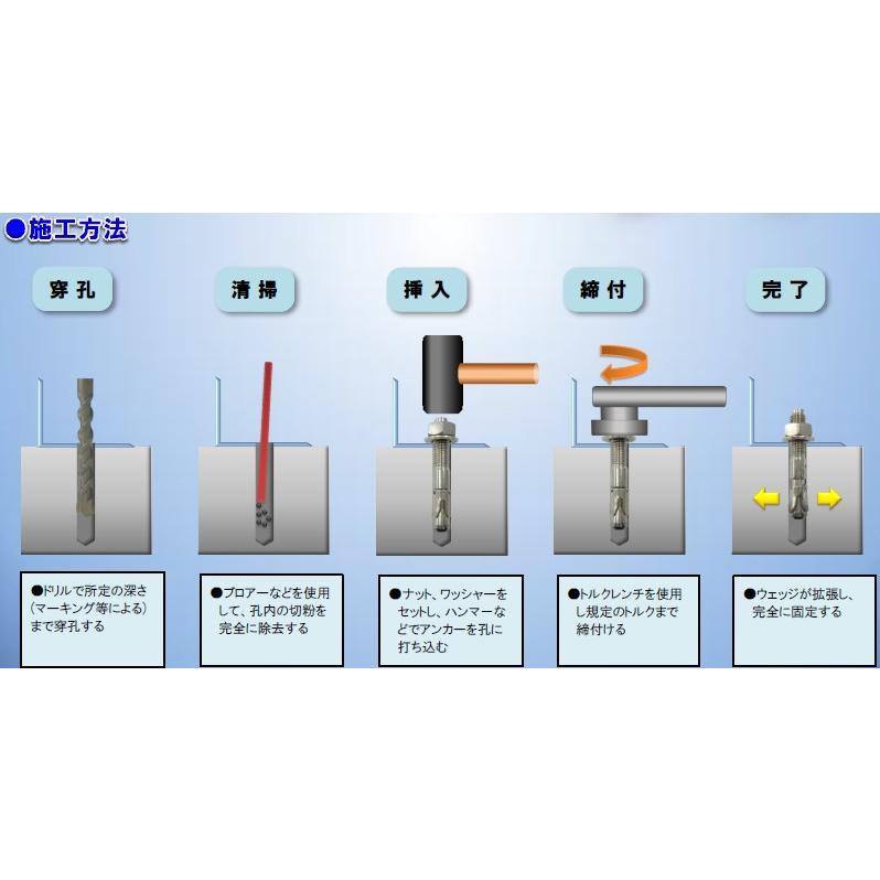サンライズ工業(株)(構造)ナットを締め付けることにより、ウェッジ部をアンカー先端の形状に沿って拡張させ、施工面の孔壁に固着する製品です。(特長)規定トルク値までナットを締め付けることで施工が完了するので、施工者が固着を確認することができます。追従拡張型でもっとも安全な構造です。外的要因(振動、コンクリート劣化)などにより、アンカーが抜けようとする力が作用した場合、拡張部(ウェッジ)が追従して拡張する安全な構造です。他の追従拡張型アンカーと異なり、ネジ径と同じ外径及び穿孔径である為、取付物の上から施工できます。トルク式のため打撃式では施工が難しい隅打ちが可能です。模様替え等によるアンカー不要時には、コンクリート内への埋込み対応が可能です。(サイズ)ねじの呼び:M10全長(mm):70ねじ長さ(mm):28.0ドリル径(mm):10.0穿孔深さ(mm):55有効埋込深さ(mm):40最大取付物厚さ(mm):7施工締付トルク(N・m):35(350kgf/cm)最大荷重(試験値)引抜(kN):20.11最大荷重(試験値)せん断(kN):13.72もれなくドリルビット(SDS軸タイプ 4枚刃)10.0X160 1本サービス。"}