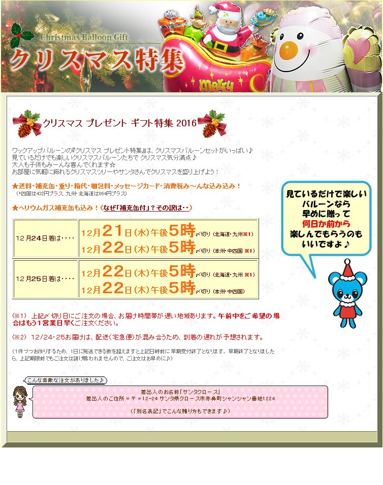 メリークリスマス!アロハシャツ&ビーチサンダル姿が可愛い♪南の島から来たサンタクロース。 リゾート気分満載なクリスマスバルーングッズ☆メッセージカード代は無料!!さらにヘリウムガス補充缶1本のおまけ付き!!高さ:セット全体 約230cm【含まれるもの】ビックシェイプバルーン 1個ジュニアシェイプバルーン 1個プリントバルーン 1個無地バルーン 3個補充用ヘリウムガス(お届け時の調整用)ウエイト(おもり)ミニゴム風船(※卓上サイズのセットを除く)無料メッセージカードリボンあなたの想いをバルーンにのせて、バルーン電報を贈ってみませんか?スタッフがひとつづつ心を込めて、お作りします。当店は創業2000年、バルーン電報ギフト総合専門ショップです。オールアバウトジャパンの「All Aboutスーパーおすすめサイト大賞」ギフト部門の受賞店です。"}