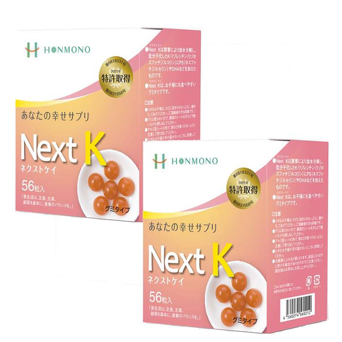 商品詳細・Next Kは酵素により加水分解したK・リゾレシチン(リゾホスファチジルコリン)に、PS(ホスファチジルセリン)やDHAなどを加えたものです。・お子様にも食べやすいグミタイプです。●内容量:2個(1個/179.2g(1粒の重量 3.2g×56粒入))●原材料:水飴(国内製造)、還元麦芽糖水飴、酵素分解リゾレシチン(大豆を含む)、ゼラチン、ぶどう糖、オリゴ糖入甜菜糖蜜、加工黒糖、りんご果汁、ホスファチジルセリン(大豆を含む)、DHA含有精製魚油/甘味料(キシリトール)、pH調整剤、乳化剤(大豆由来)、ビタミンC、香料、光沢剤、ビタミンB1、ビタミンE、ナイアシン、パントテン酸Ca、ビタミンB2、ビタミンB6、ビタミンA、葉酸、ビタミンD3、ビタミンB12●直射日光、湿気を避け、涼しい所に保存してください。●栄養成分表示(1粒(3.2g)中)熱量…10.91kcal、たんぱく質…0.25g、脂質…0.08g、炭水化物…2.30g、食塩相当量…0.0008g大豆リゾレシチン…300mg、ホスファチジルセリン…10mg●おすすめのお召し上がり方健康食品として1日あたり3〜6粒を目安に、噛んでゆっくり溶かしてお召し上がりください。
