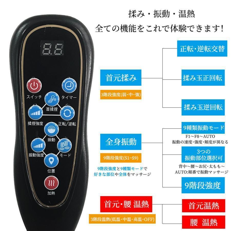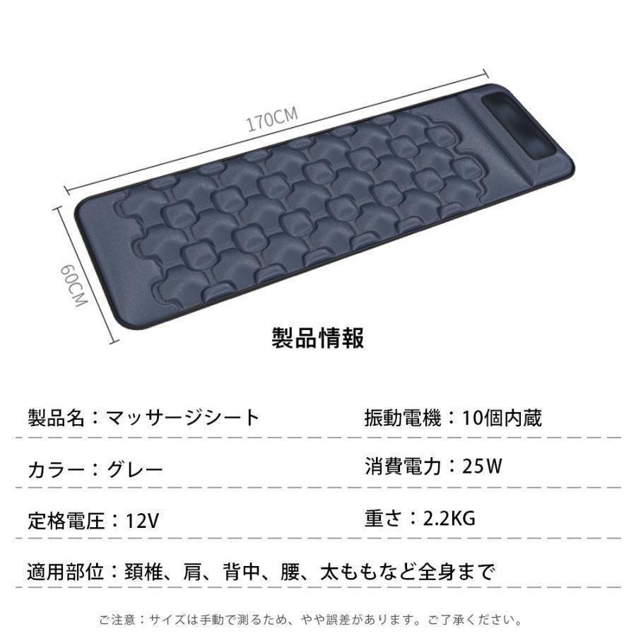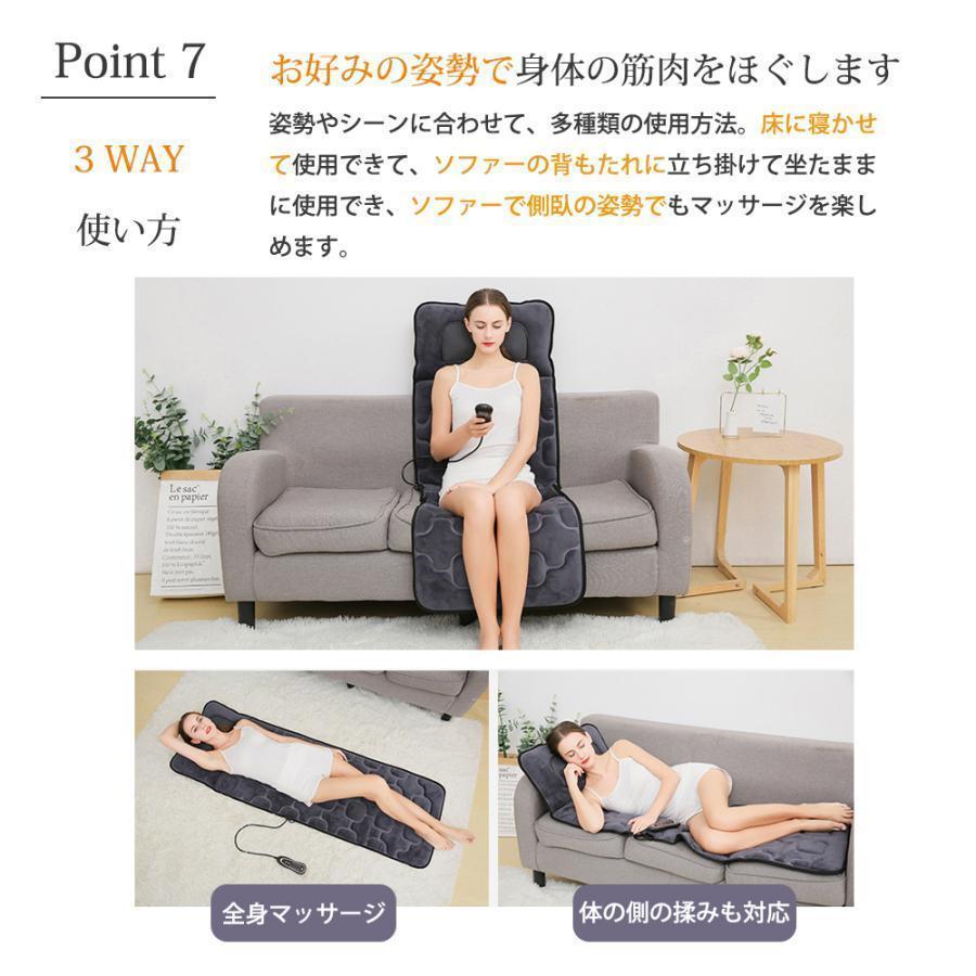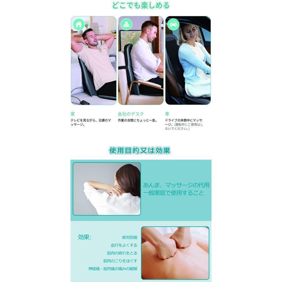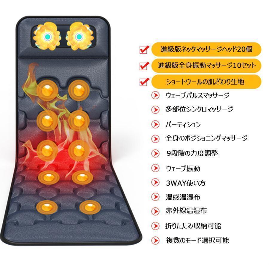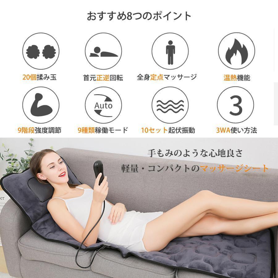 マッサージシートは全身対応で首から肩、背中、腰、お尻まで幅広くフィット。もみ、振動の機能で本格的なマッサージを実現します。梱包サイズ: W37.5×D61×H20cm寸法(約):幅56×奥行156×厚さ3cm折畳るサイズ(約):幅56×奥行35×厚さ7cm重量(約):2.2kg素材:PVC、ポリエステル定格電圧・周波数:AC100V?240V 50/60Hz消費電力:24Wタイマー:10/20/30分内容セット:収納袋x1、マッサージシート本体x1、リモコンx1、ACアダプターx1、取扱説明書x1、保証書x1※注意事項:該当商品はリラックス用品です。医療用品ではございません。家やオフィスでの全身用&マッサージャーに最適:マッサージャーは、両親、家族、友達、そして長老のための完璧な贈り物です。循環のためのこのマッサージャーは、自宅やオフィスや旅行中に使用するのが良いです。検索関連キーワードマッサージ枕 マッサージ 首・肩・腰・背中・太もも マッサージャー 小型 マッサージ機器 フット 足裏 癒しグッズ疲労回復 首