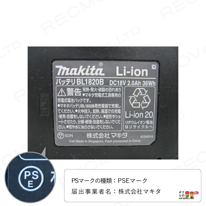 PSマークの種類:PSE届出事業者名:株式会社マキタマキタ 18V バッテリー BL1820B A-61715Li-ion 2.0Ah充電時間(充電器DC18RF使用時)実用充電:約15分フル充電:24分