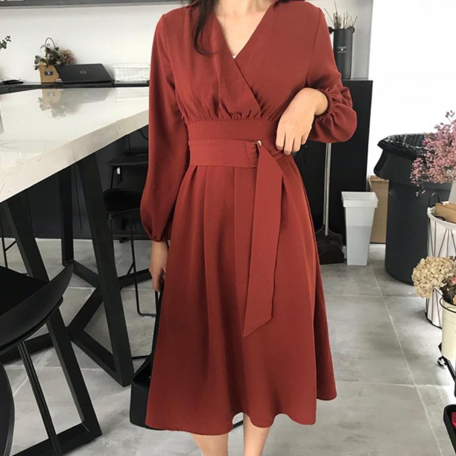 カシュクール ロングワンピース 長袖 フレア Vネック ミディ丈 ウエストマーク レディース