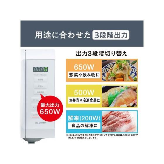 【仕様】●電源:AC100V(50Hz/60Hz)●定格消費電力:50Hz/950W、60Hz/1300W●定格高周波出力:50Hz/500W、200W相当・60Hz/650W、500W、200W相当●発振周波数:2450MHz●庫内総容量:約18L●加熱室有効サイズ:約W315×D325×H180mm●タイマー:10秒〜15分●コードの長さ:約1.5m●区分名:A●電子レンジ機能の年間消費電力量:50Hz/59.5kWh/年、60Hz/59.5kWh/年●年間待機時消費電力量:0.0kWh●年間消費電力量:50Hz/59.5kWh/年、60Hz/59.5kWh/年●保証期間:お買い上げ日より1年間●PSEマーク取得済