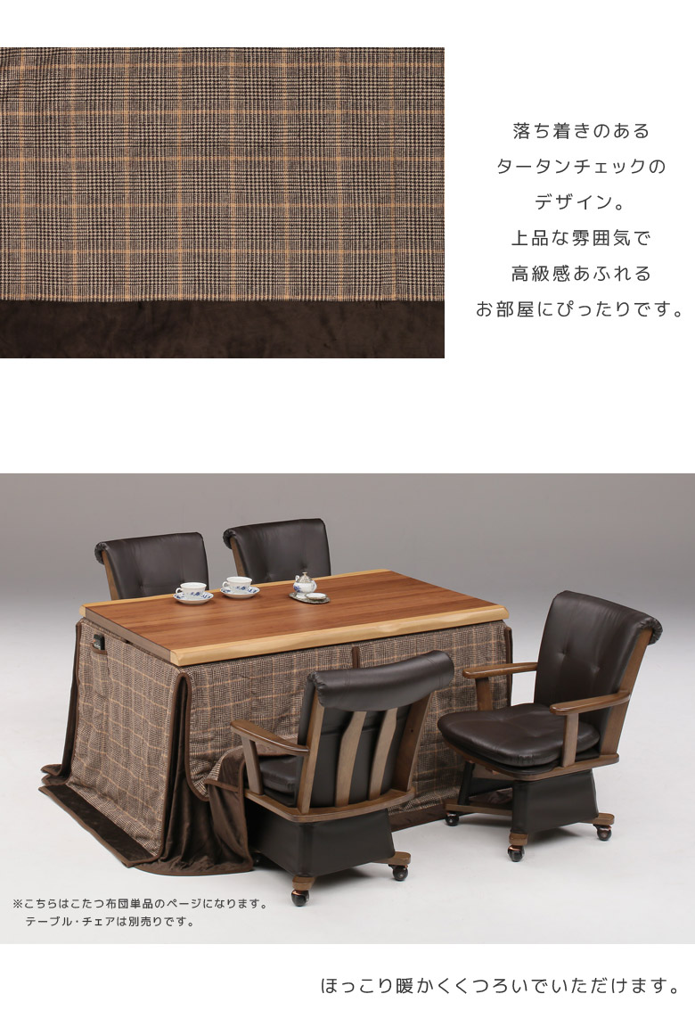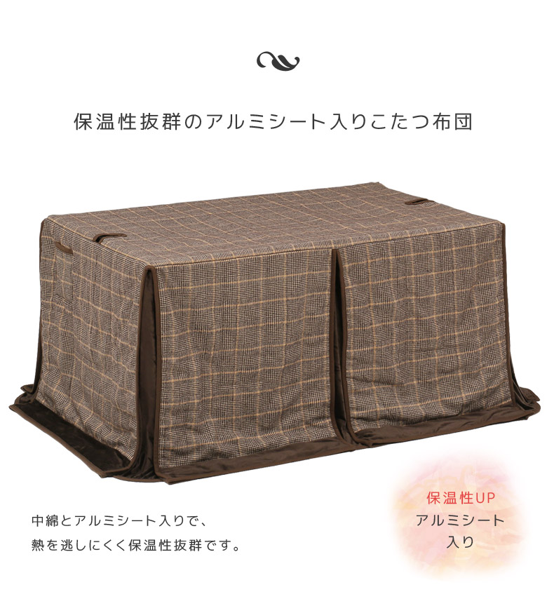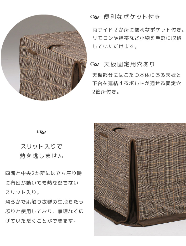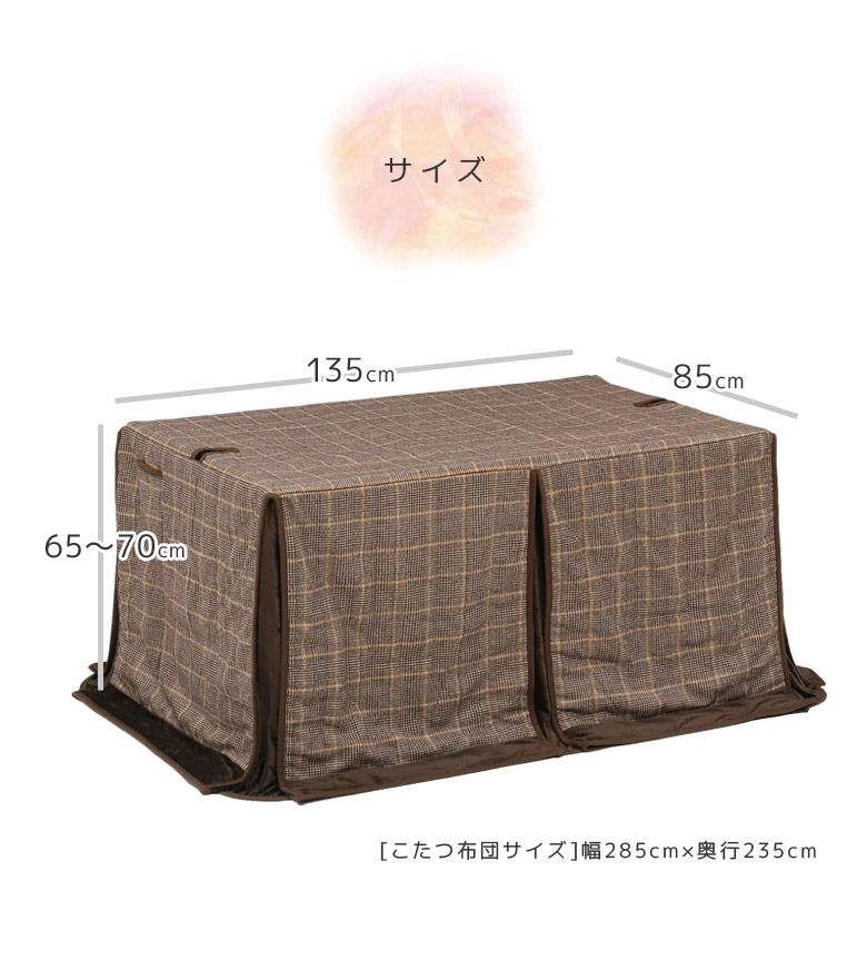 ■商品の特徴やさしい肌触りの生地を使用。アルミシート入りで保温性抜群。天板と本体を連結するボルトが通せる固定穴2か所付き。左右サイド2箇所に便利な収納ポケット付き。■主な仕様135cm×85cmハイタイプこたつ用アルミシート入り天板固定用穴あり収納ポケット2箇所付きスリット加工■サイズ幅285cmx奥行235cm■材質ポリエステル■布団柄ブラウンタータン■備考輸入品完成品*こちらの商品はメーカーからの取り寄せとなります。在庫確認後改めて納期をお知らせいたします。お急ぎの方、また購入をご検討の方は事前に在庫をお問い合わせください。※モニターの発色具合により、実際の色味と異なる場合がございます。予めご了承ください。■送料送料無料(一部地域を除く)※北海道・東北:別途送料がかかります。※沖縄・離島:送料は、別途お見積りとなります。別途送料につきましてご質問等がございましたら、お気軽にお問い合わせ下さい。こたつ布団 こたつ 長方形 省スペース 135 こたつふとん コタツ