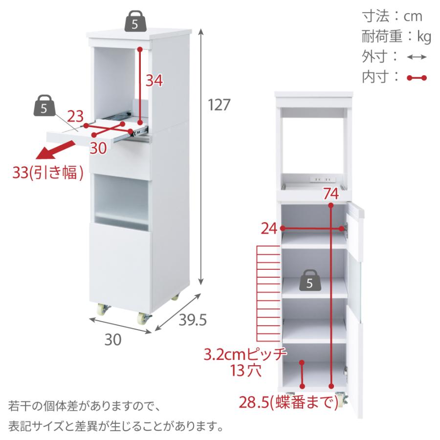 ■商品説明 家電の収納に便利なコンセント付きスライド棚と、収納物に合わせて高さ調節ができる可動棚付きのラックをこれ1台で。ハイタイプは収納量も抜群。キッチンのちょっとした隙間に設置すれば、それまでのデッドスペースを有効活用できます。■本体サイズ [外寸]幅30×奥行39.5×高さ127cm■組立時間(目安)(大人2人) お客様組立(60分)■キーワード スリムラック すき間 キッチンすきま収納 隙間家具 すき間家具 隙間キッチン キッチンボード 洗面所 スライド 棚 木製 キャスター付 コンセント付 電気ポット コーヒーメーカー 炊飯器 食器 家具 おしゃれ 収納 新生活 ひとり暮らし 30センチ 幅30cm 奥行40cm 127cm 高さ125 高さ130 125cm 135cm