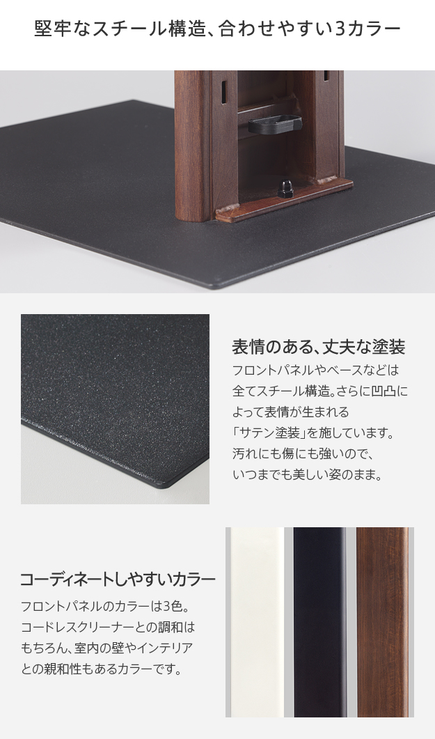 ※メーカー直送のためはお受けできません。※沖縄・一部離島は別途送料がかかります。お見積もりいたしますのでお問い合わせ下さい。【カラーバリエーション】サテンホワイト・サテンブラック・ウォールナット【仕様】本体・固定棚板:スチール棚板・丸棒:スチール◎組立品【クリーナー対応機種】Dyson:V6・7・8・10・11・12・15/DC35・45・62・74/Digital Slim・MicroTOSHIBA[TORNEO V]:VC-CL1400/1500・VC-CL400Panasonic[iT]:MC-SBU510J/MC-PBU510J/520JSHARP[TREED]:EC-SX【ロボット掃除機対応機種】iRobot RoombaシリーズPanasonic RULOシリーズHITACHI minimaruシリーズDyson360Eye(サテンホワイトのみ収納可能)Dyson360Heurist【サイズ】本体:幅29.5x奥行38x高さ130~146.5cm・約8kgフロントパネルサイズ:幅15.5x奥行3x高さ130~146.5cmベースサイズ:幅29.5x奥行38(27)cm・厚み3mm揺れ防止棚サイズ:幅11.5x奥行10.5x立ち上がり高さ2.5cm棚板1:幅10x奥行8cm/ツール立てx2本棚板2:幅10x奥行8cm/ツール立てx1本棚板3:幅10x奥行8cm/ツール支え高さ6cm重量:各約150g株式会社ナカムラ(I-3600179)