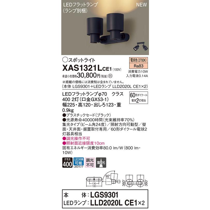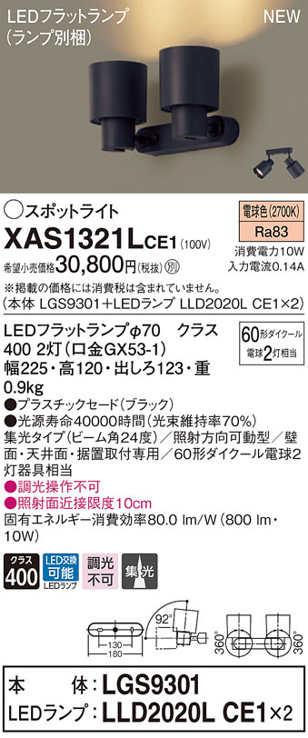 XAS1321L CE1【本体】LGS9301【LEDランプ】LLD2020L CE1光源◆LEDフラットランプφ70 クラス400 2灯(口金GX53-1) ◆色温度:2700 K ◆光源寿命40000時間(光束維持率70%)寸法・質量◆幅:225 mm ◆高:120 mm ◆出しろ:123 mm◆質量:0.9 kg仕様◆器具光束:800 lm ◆電圧:100 V ◆消費電力:10 W ◆消費効率:80 lm/W◆【プラスチックセード】ブラック◆天井直付型・壁直付型・据置取付型◆Ra83◆集光タイプ(ビーム角24度)◆照射方向可動型◆可動範囲上下92度◆回転方向360度◆壁面・天井面・据置取付専用◆60形ダイクール電球2灯器具相当◆入力電流(100V時):0.14 A◆調光操作◆照射面近接限度10cm