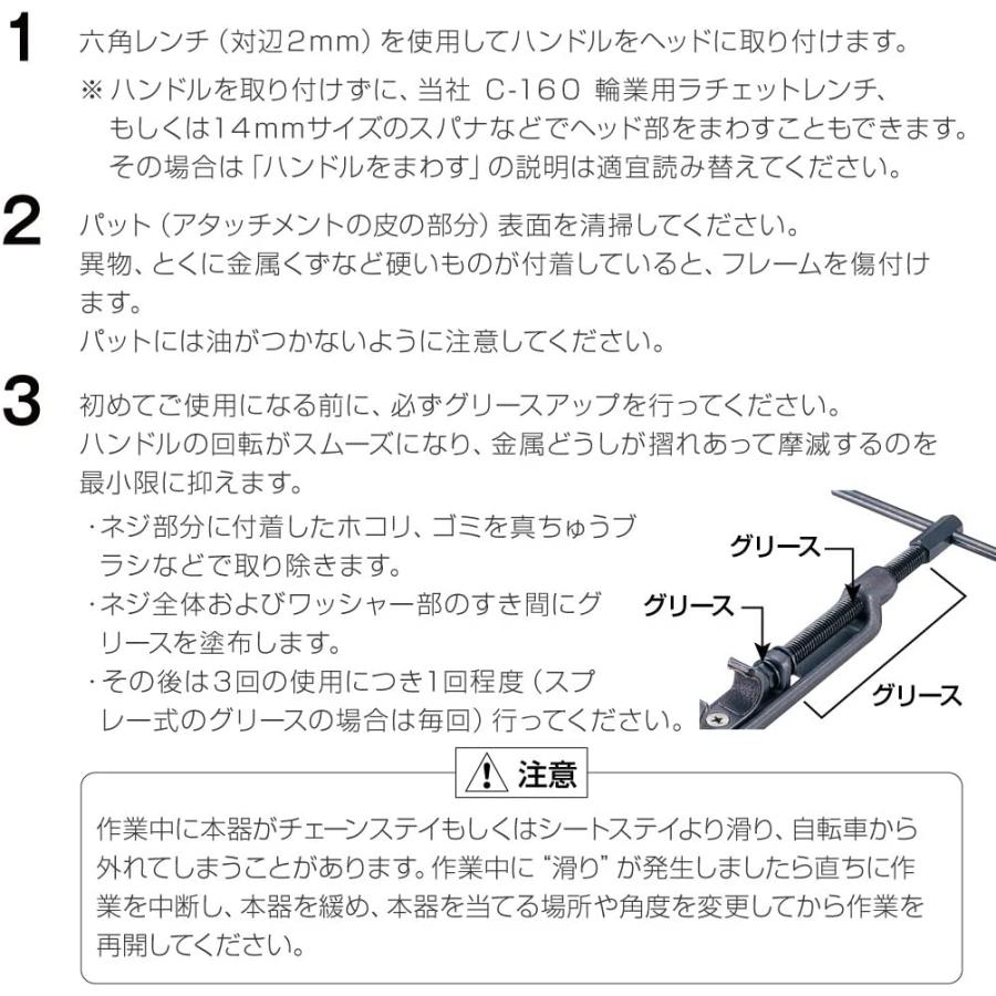 商品スペックメーカー名ホーザン(HOZAN)全長305〜405mm最大開き幅160mm閉じ幅80mm重量880g商品説明フレームに固着したハブの取り外しや、ホイールをフレームに装着したままでのタイヤ、チューブの入れ替えなど、フレームを一時的に拡張させる工具です。アタッチメントはフレームの角度に応じて動きますので急角度フレームでも滑らず傷がつきません。ハンドルは半固定式ですので、連続作業時にはハンドルを外して14mmソケットレンチなどの使用が可能です。