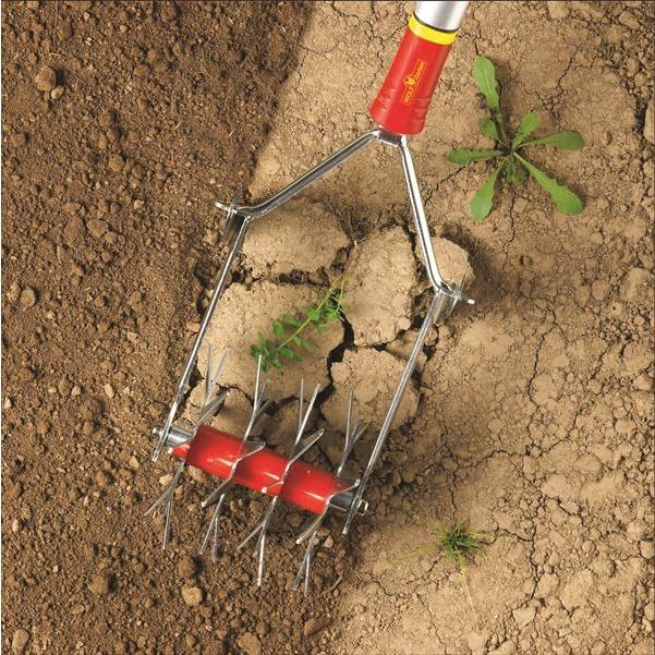前面の車輪で土を耕して通気を確保する主導の耕運機。刃は塊になった土を砕いたり、雑草を除去することもできます。DK-Mに比べて、より深い耕運が可能です。