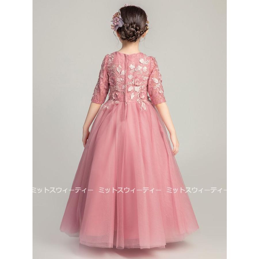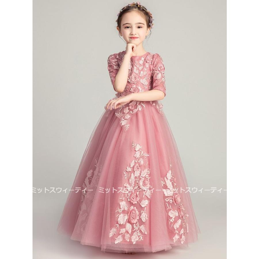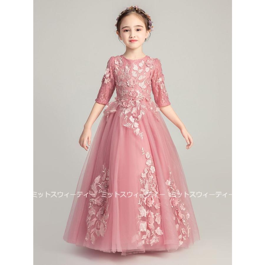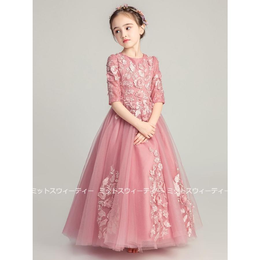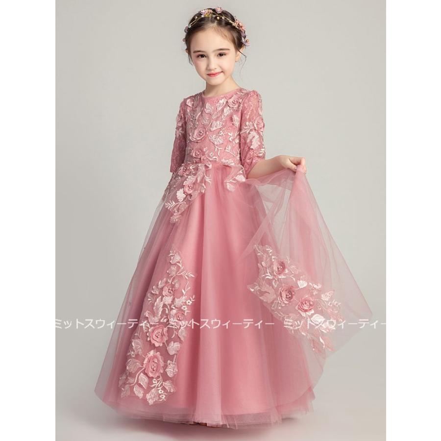 ピアノ発表会 子供ドレス 花飾り ロングドレス キッズドレス 女の子 中袖 フォマールドレス ガールズ ワンピース レース フラワーガール 子ども ドレス ピンク