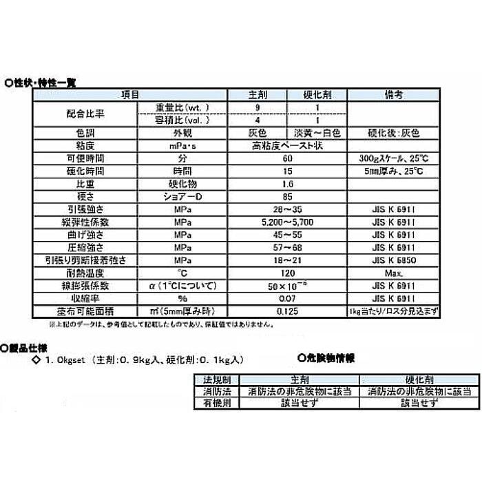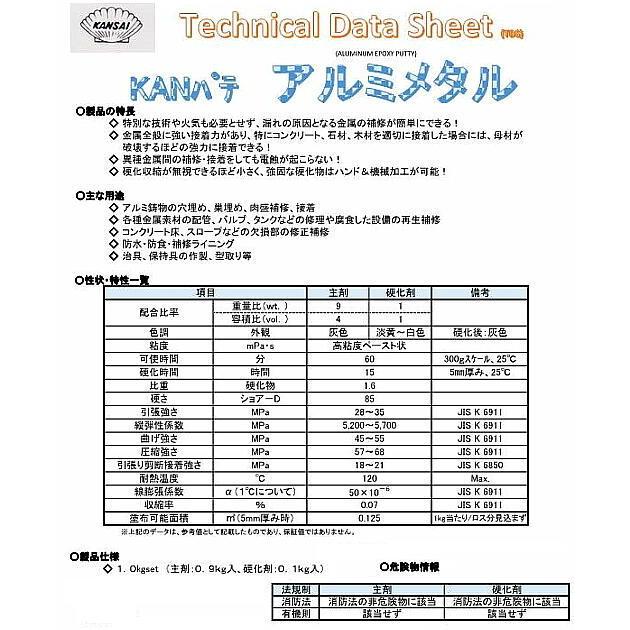 KANパテ アルミメタル? アルミ製部品の設備、アルミ鋳物の補修など 関西パテ化工 1kg製品の特長●特別な技術や火気も必要とせず、漏れの原因となる金属の補修が簡単にできる。●金属全般に強い接着力があり、特にコンクリート、石材、木材を適切に接着した場合には、母材が破壊するほど強力に接着できる。●異種金属間の補修・接着をしても電着が起こらない。●硬化収縮が無視できるほど小さく、強固な硬化物はハンド&機械加工が可能。主な用途●アルミ鋳物の穴埋め、巣埋め、肉盛り補修、接着。●各種金属素材の配管、バルブ、タンクなどの修理や腐食した設備の再生補修。●コンクリート床、スロープなどの欠損部の修正補修。●防水、防食・補修ライニング。●治具、保持具の作成"}