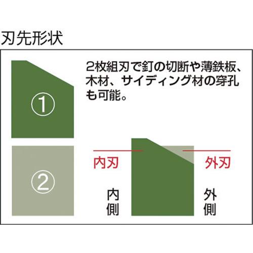 | 特長: | 内刃先行の2枚組刃で、金属張りサイディング材やステンレス張り木材、(金属+断熱材+合板)などの複合材も一発で穴あけ可能です。 木質系材の穴あけは、切りくずの排出が良いため、釘の切断、薄鉄板の重ね切りも可能です。 |