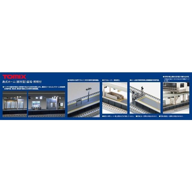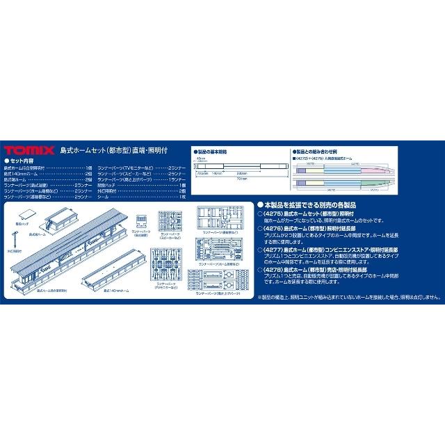 【メーカー】トミーテック【品番】4272【スケール】Nゲージ【商品状態】新品です【注意事項】※こちらの商品は外部倉庫に保管した商品となるため、12:00までのご注文で翌営業日の発送となります。 外部倉庫(1日目:12時まで)→当社配送窓口(2日目)→お客様(3日目以降)※外部倉庫の発送窓口は、土日祝の発送が停止している為、金曜12:00以降のご注文については、火曜日以降の発送となります。・色合いは、実物と画像で異なって見える場合がございます。ご利用のモニターによっても色合いは違って見えます。・画像はサンプルの画像となります。島式ホーム(都市型)照明付においてホーム両端が直線状のホームセット。【特徴】●島式ホーム(都市型)のデザインを踏襲、並べて使用可能●島式ホーム(都市型)同様に屋根付ホームをホーム中央に配置可能【島式ホーム(都市型)機能】●55.5mmの複線レール区間(700mm必要)の線路間に配置して使用●島式ホームセット(都市型)や対向式ホームセット(都市型)と並べる場合は本製品のホーム同士は付属のジョイントで端ホーム+140mmホーム+中間ホーム+140mmホーム+端ホームの順番で中間ホームがホーム中央になるように連結●ホーム端部には高架ホームに使用時に作業員の落下を防止する端壁を取付可能●照明が組み込まれ、番線標、駅名標、自販機、待合室、エレベーター、外灯が点灯(番線標はユーザー取付)●ホームジョイント、ホーム端階段、エスカレーター等は取付済【ホーム(都市型)照明付共通機能】●ホーム上面には点字ブロックと線路への落下防止滑り止めを印刷済●ホーム(近代形)よりホーム高さを1.5mm上げて車両の扉の下端とホーム高さを合わせることで乗降段差の少ないバリアフリー対応のホームを再現※ホーム高さUPにより<4033>橋上駅舎(近代型)、<4040>ニュー橋上駅舎、 ホーム(近郊形)との組合せには付属の高さUPパーツを使用●ホーム端部に端階段と端柵および非常停止警報機を取付可能●鉄道用の各種安全・保安装置を取付可能※照明のないホーム(都市型)製品との連結組合せ使用は【商品内容】●島式ホーム(都市型)待合室照明付×1●島式140mmホーム(都市型)×2●島式端ホーム(都市型)×2【付属品】●ランナーパーツ:外灯他●ランナーパーツ:プリズム板他●ランナーパーツ:高さUPパーツ●ランナーパーツ:ホームジョイント他●パーツ:外灯照明付●シール:駅名、番線表記等