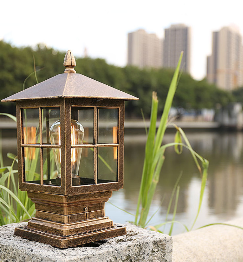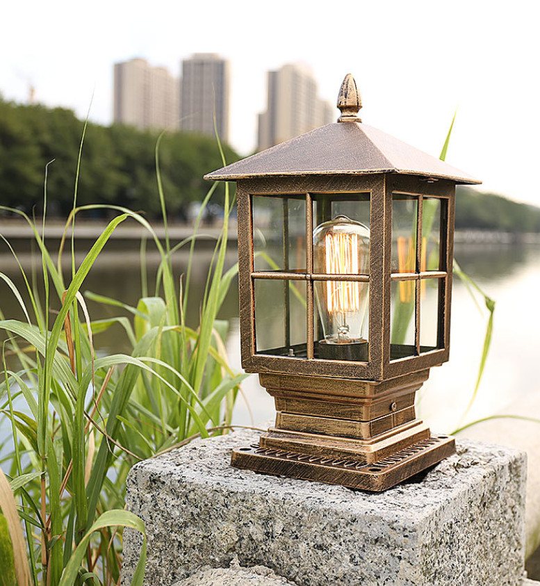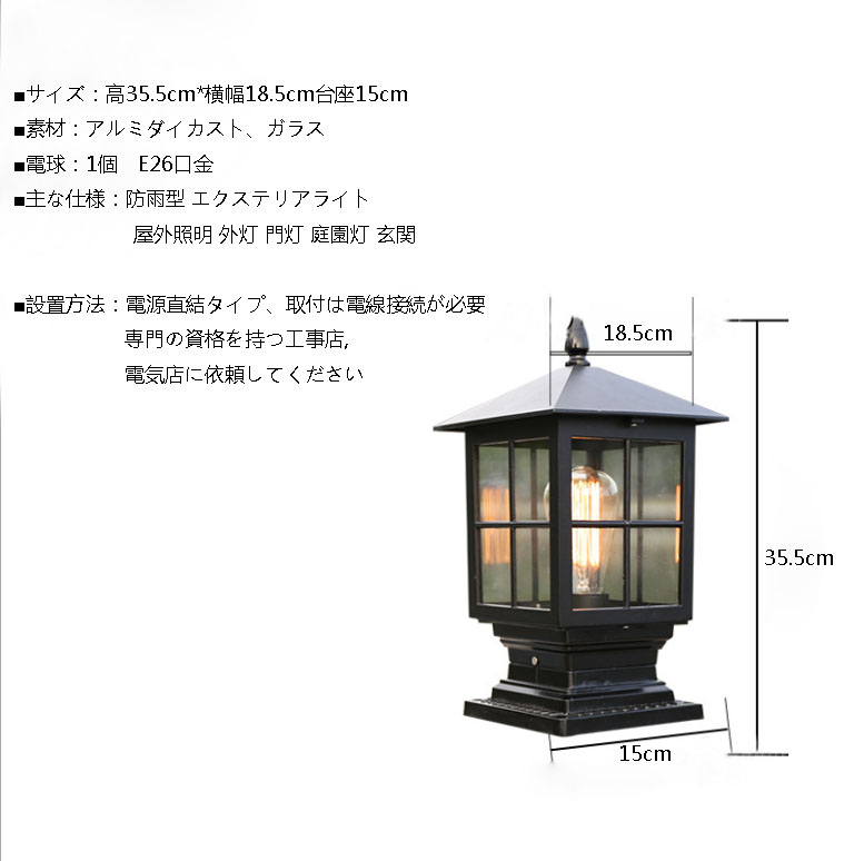 照明器具 門灯 防雨 外灯 門柱灯 レトロ 庭園灯 玄関 照明 LED 屋外照明 柱上付け照明 ガーデンライト門柱灯 外灯 照明器具 門灯 スタンドライト門柱灯 屋外照明で素敵にエントランスを演出! アンティーク 玄関照明!重厚な存在感とノスタルジックな雰囲気が魅力です。暗くなって灯る明かりが家族のスタイルを映し出す様なレトロ照明です。■サイズ:高35.5cm横幅18.5cm台座15cm■素材:アルミダイカスト、ガラス■電球付き:1ケ/E26口金■主な仕様: 防雨型 エクステリアライト 屋外照明 門柱 庭園 玄関※取付方法:、電源直結タイプです、裏側に電線の結線がございます,取付は電線接続が必要なので、専門の資格を持つ工事店、電気店に依頼してください。※弊社製品は職人が一つ一つ手作りで製作しているため若干の個体差がある場合がございます。細部の仕様については変更になる場合がございます、予めご了承ください。※商品到着後万が一初期不良がございましたら迅速に対応させていただきます。なお、(イメージと違う、サイズ、重量が合わなかったなど)お客様ご都合による返品、交換は受け付けておりません。 必ず上記説明等をよくご確認の上、ご注文手続きをお願いいたします。"}