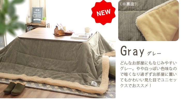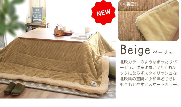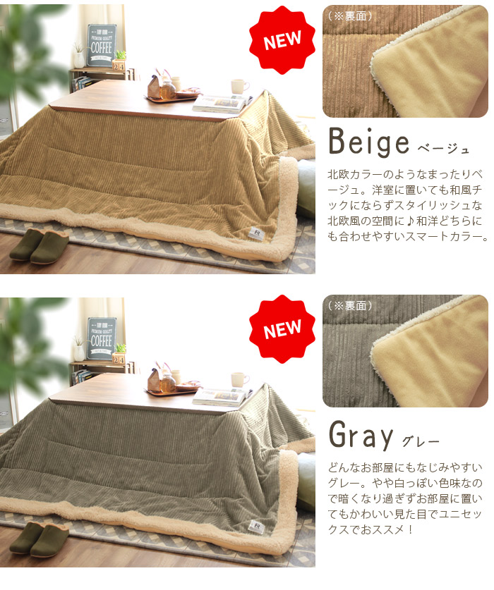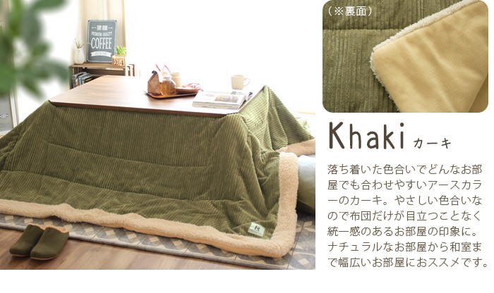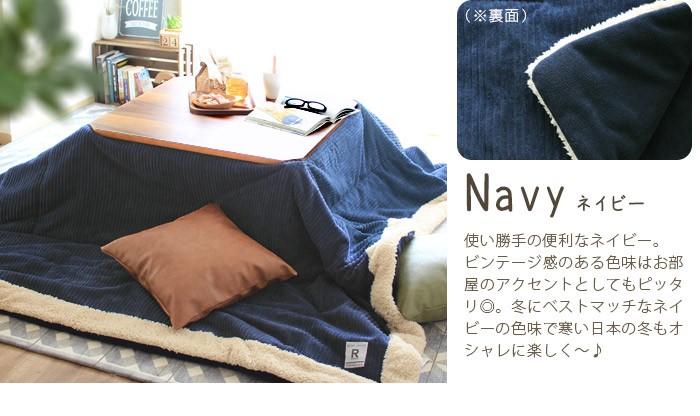 「コーデュロイ × 中綿 × フリース」3層構造!!極暖こたつ掛布団 表面は保温効果が高いパイル織物の一つ「コーデュロイ」を使用し中材には、たっぷりフワフワの中綿を使用。直接肌に触れる内側は肌に優しいフリース素材の贅沢3層構造掛け布団!コタツヒーターで温まった空気を外に逃がすことなく内側にとどめておくことで、コタツの中はいつでもポカポカ。冬のかじかんだ心も体もこれ一枚で「ホッ」と温める、冬におススメの一品です♪