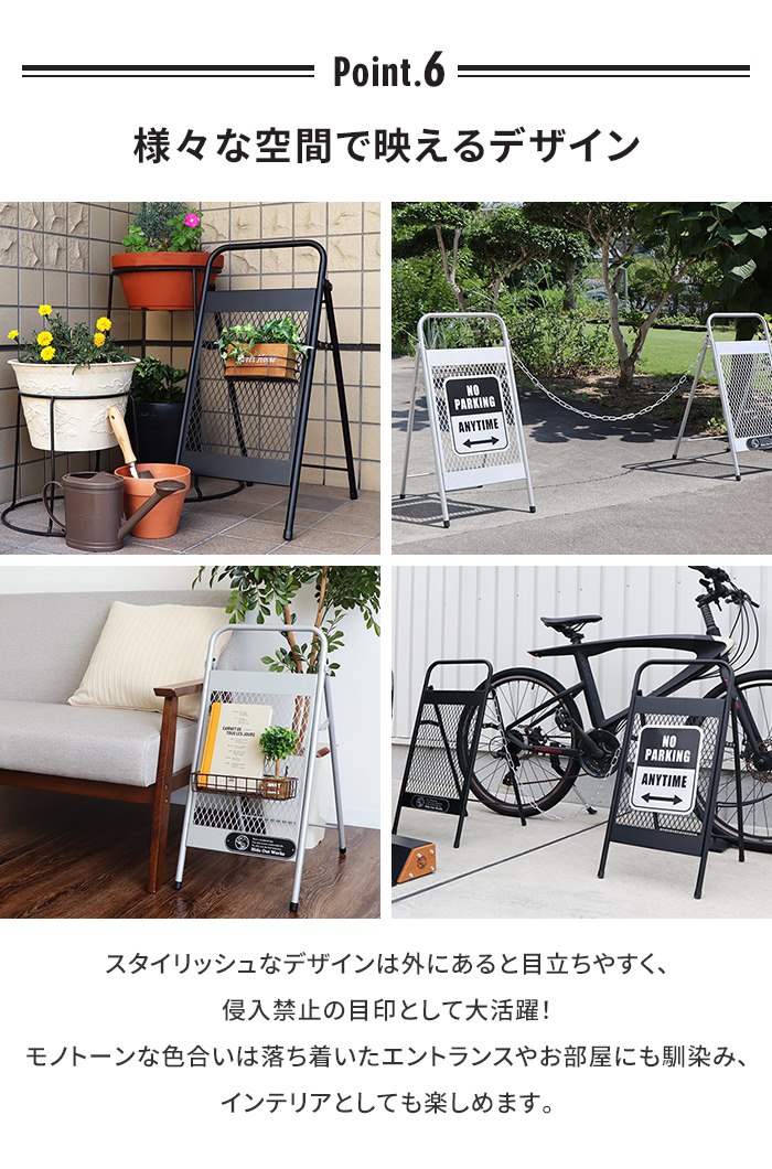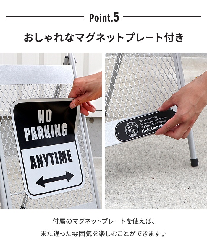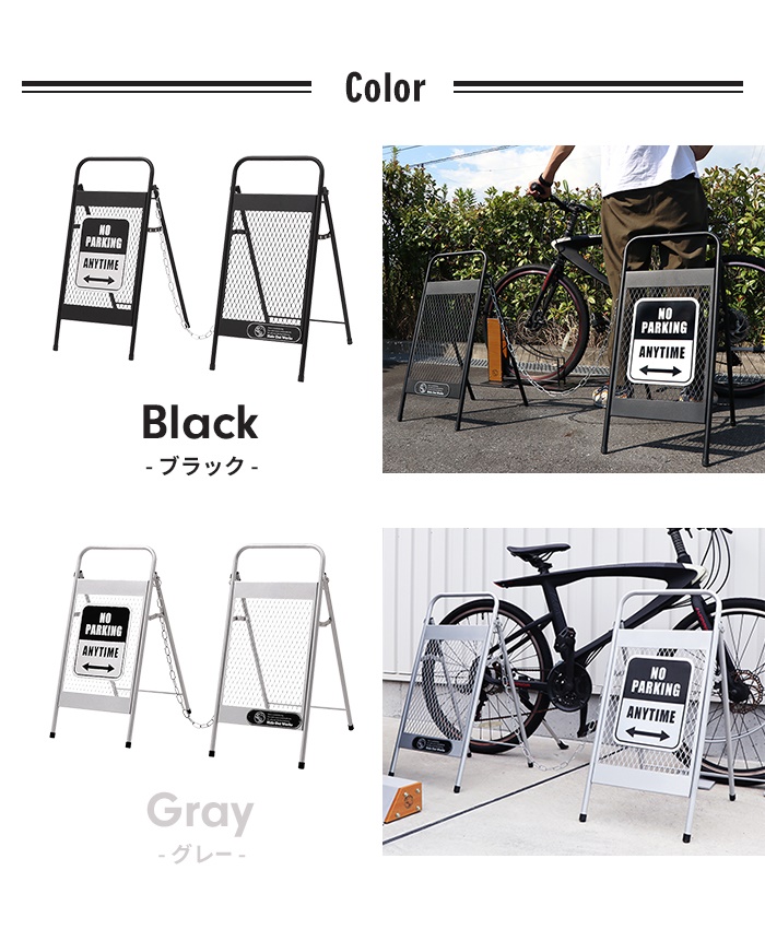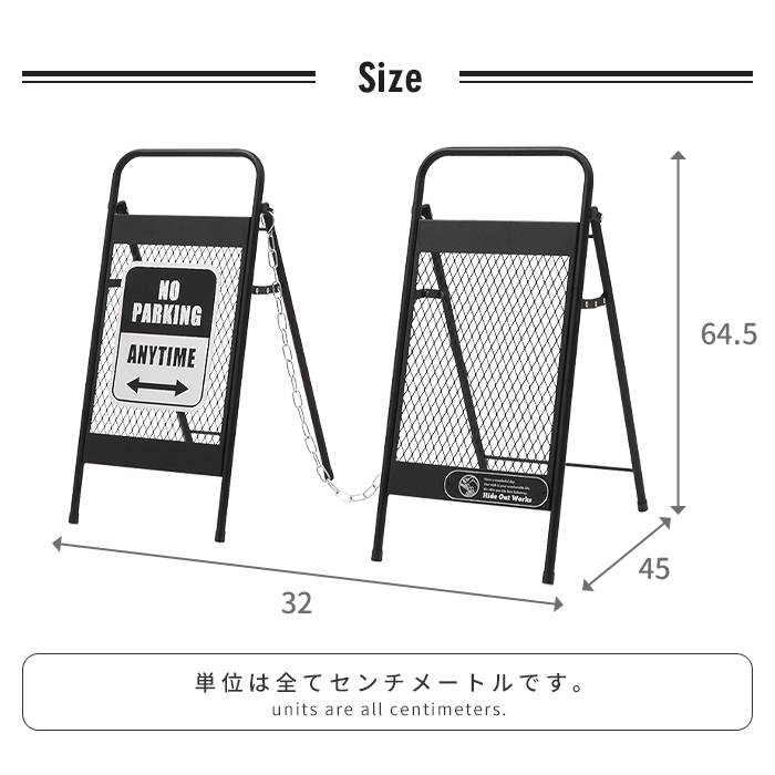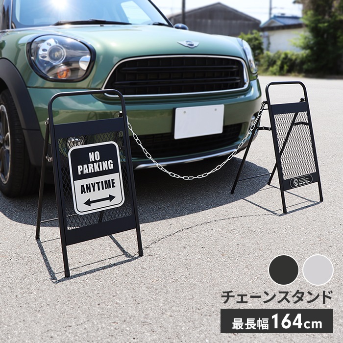 スタイリッシュなデザインで外に置くだけで目立ちやすく、侵入禁止の目印として大活躍するアメリカンフェンス調チェーンスタンド。脚が大きく開くので安定感があり、倒れづらい設計になっています。※脚は固定できる仕様ではありません。▼ 製品サイズ[本体]約幅32×奥行45×高さ64.5cm[チェーンの長さ]約1m▼ 重量約1.6kg(1台あたり)▼ 材料金属(鉄)▼ 表面加工粉体塗装(腐食防止加工済み)▼ 付属品チェーン、装飾用プレート、クッションシール(折り畳み時の傷付き防止)▼ 組立区分完成品▼ 生産国中国▼ 注意事項※本製品には腐食防止加工を施しておりますが、濡れたまま放置すると変色や腐食が発生する恐れがあります。こまめに水気を拭き取ってください。※強風・台風など気象条件が悪い場合は転倒する恐れがあります。屋内に移動させてください。※個体差やロット・モニター環境等により、色味やサイズが若干表記と異なる場合がございます。±1〜2cm程度の誤差は許容範囲となりますので、あらかじめご了承の上ご購入下さいませ。▼ カラーブラック,グレー