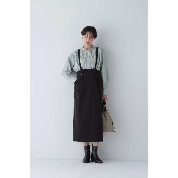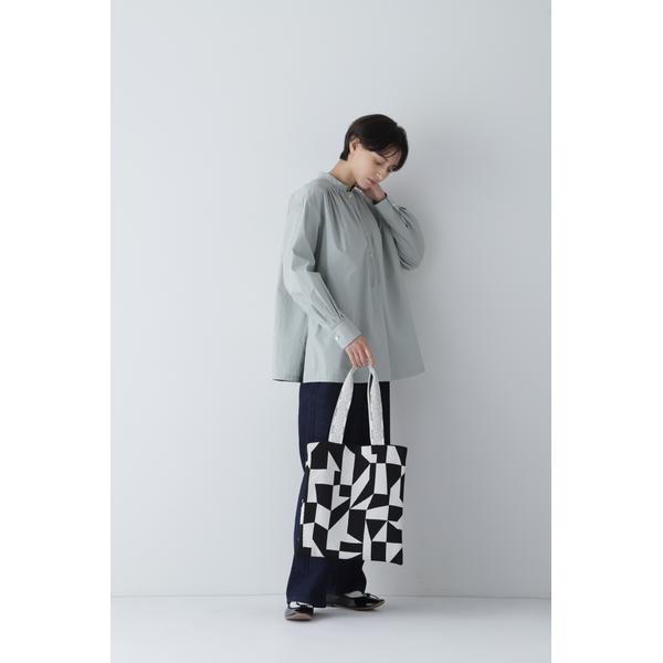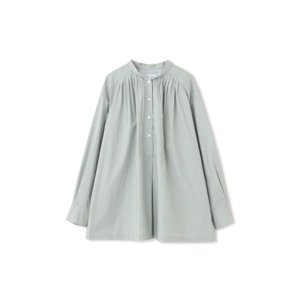 襟周りにタックをたっぷりと入れたボリュームブラウスです。スタンドカラーに共生地の細リボンをたたき付けてポイントにしています。やや長めの着丈感ですが、脇のスリットを深めにとることで軽い印象に仕上げました。