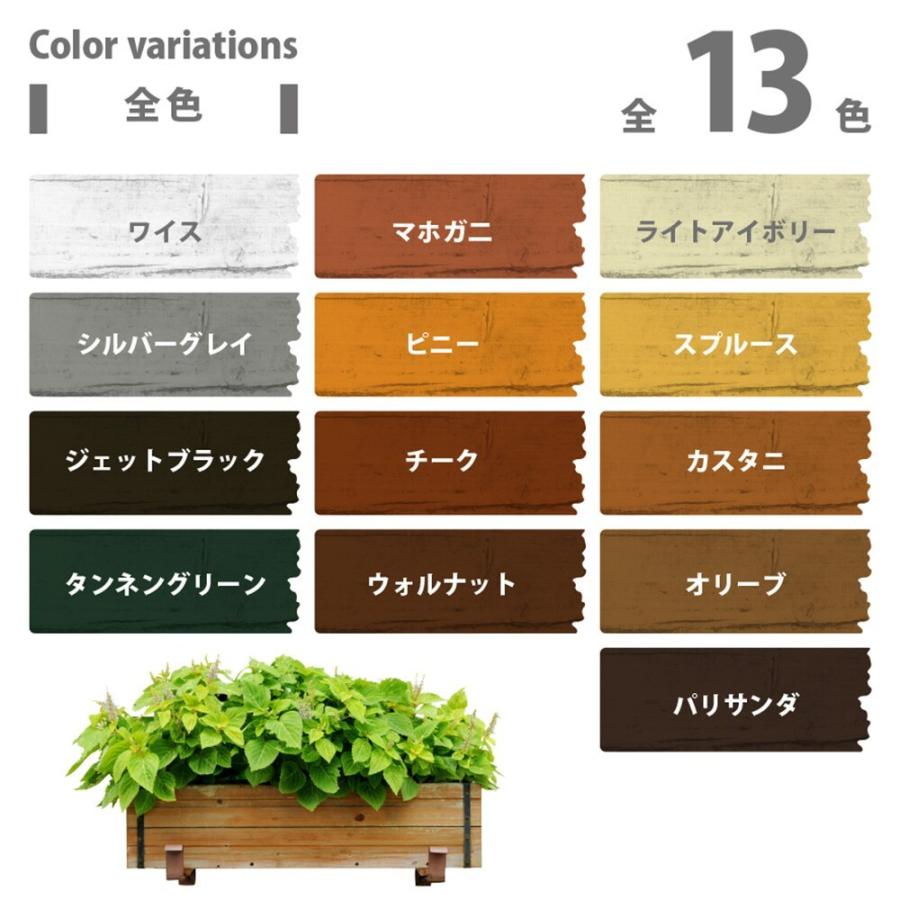 ■特殊な塗膜で木材を保護します。■表面に膜を作り着色する半造膜性能と内部に浸透し保護する浸透性能を兼ね備えた、[浸透タイプ]と[造膜タイプ]の中間タイプです。■優れた木材防腐、防カビ、防虫効果を発揮します。■塗膜の3大特長(柔軟性・通気性・密着性)により、業界最高クラスの耐久性を発揮。■色つきが良く、古材や濃い色の木材でも明るく仕上げることができ、塗替えに最適です。※防虫の対象はヒラタキクイムシなどの木材害虫です。シロアリ、アリ、ハチなどは対象外です。※立地条件や周辺環境、建物の構造などにより、効果の持続性は異なります。[容量]3.4L[用途]屋外木部 防虫防腐塗料[使用方法]ハケ又はローラー塗り/2回塗り(スプレー塗装)[標準使用量]0.11〜0.16L/m2(2回塗りの合計量)[塗料タイプ]半造膜塗料/水性半浸透/木目を生かした仕上げ※品質向上のため予告なく仕様を変更する場合がございます。パッケージのリニューアル等につき、商品画像が異なる場合がございます。商品画像の色合いは、画像処理上、若干異なる場合がございます。