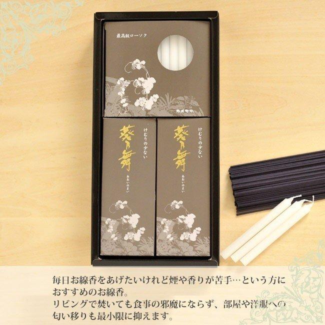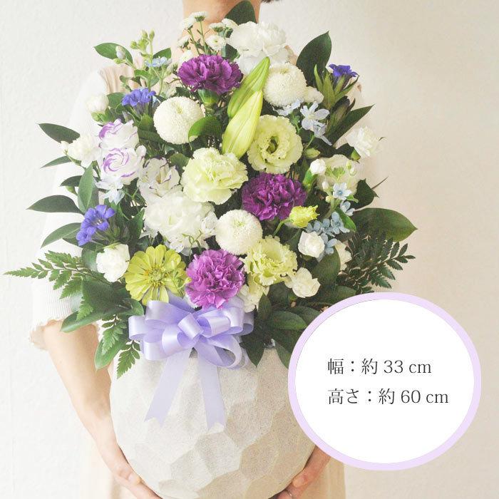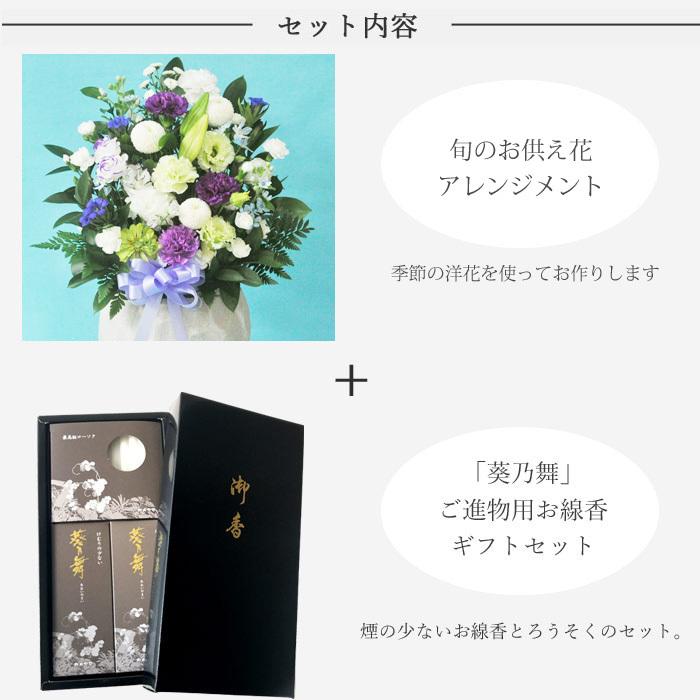 ユリなど季節のお花を使用したアレンジメント◆お供えアレンジ高さ約60cm×幅約33cm※花材によってサイズが変ることがございます。 ◆線香セット「葵乃舞」小函寸法 14×28×4.3センチローソク寸法 ローソク:φ0.93×10.2センチセット内容 大ローソク1号5(18本入)×1函葵乃舞煙少香(約36g)×2函燃焼時間 ローソク:約1時間 線香:約25分日本製※北海道、沖縄を含む離島へのお届けは出来ません。お供え お悔み 仏花 供花 法事 法要 仏事 御仏前 お盆 新盆 初盆 お彼岸 四十九日 月命日 一周忌初七日用 四十九日用祥月命日 年忌法要喪中はがきが届いたら喪中お見舞い