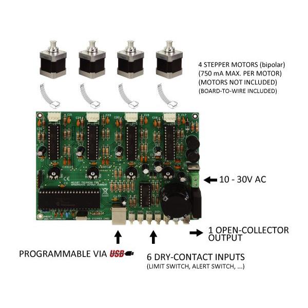 ・4つの独立したステッパーモーター駆動に・バイポーラーモーターに適正・トリマーで電流値はそれぞれ調整可能・過電流保護感知・USB接続:PCからモーターを制御・オリジナルソフト用にDLL供給・基板との接続用ケーブル付属各モーターへの電源供給: 750mA 継続, ( 1Aピーク) ワイドレンジAC入力:5〜30V 6つのドライコンタクト入力(緊急停止用など)1ロジックオープンコレクタ出力電源:10〜30VAC 寸法:140 x 100 x 30mm・4つの独立したステッパーモーター駆動に