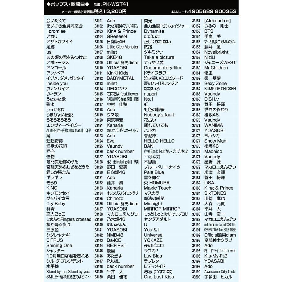 | パーソナルカラオケ オンステージ Wシリーズ(USBタイプ)専用追加曲チップ 2021年発売曲中心 ポップス・歌謡曲100曲入り 【対応機種】 PK-WA100(S)/PK-WT01 2022年6月現在 ※ご注意:本チップは、PK-Wからはじまる本体品番での再生に対応しております。 「Z-PK」「PK-X」「PK-F」「PK-数字」からはじまる本体をお持ちの方は「PK-ST」からはじまるチップを、「PK-N」からはじまる本体をお持ちの方は「PK-NST」からはじまるチップをお買い求めください。 【曲目】 商品画像をご参照ください。 【付属品】 取扱説明書(保証書一体)、曲目リスト 【輸入・発売元】 佐藤商事株式会社 お客様相談窓口TEL:0120-310-750 ・オン・ステージとは: 中村泰士先生監修 パーソナルカラオケ「オンステージ (ON STAGE)」は、テレビに接続するだけで、誰でも・どこでも簡単にカラオケが楽しめる家庭用マイク型カラオケです。 ワイヤレス・ワイヤードと、お客様のご使用スタイルにあわせた機種を発売。各々の機種ともに、多様な内蔵曲と様々な機能を搭載した家庭用カラオケ「オン・ステージ」は、お年寄りからお子様まで、カラオケ初心者から上級者まで幅広いユーザーからご好評いただいております。 【収録曲】 33101 会いたくて Ado 33102 あいつら全員同窓会 ずっと真夜中でいいのに。 33103 I promise King & Prince 33104 アカリ GReeeeN 33105 アザトカワイイ 日向坂46 33106 足跡 Little Glee Monster 33107 us milet 33108 あの頃の君をみつけた SKE48 33109 アポトーシス Official髭男dism 33110 アンコール YOASOBI 33111 アン/ペア KinKi Kids 33112 イジメ、ダメ、ゼッタイ BABYL 33113 inside you milet 33114 ヴァンパイア DECO*27 33115 ヴィラン てにをは feat.flower 33116 うたかた歌 RADWIMPS feat. 菅田将暉 33117 歌よ 中村佳穂 33118 うっせぇわ Ado 33119 うまぴょい伝説 ウマ娘 33120 うるうるうるう 東京事変 33121 エンヴィーベイビー Kanaria 33122 ALMIGHTY〜仮面の約束 feat.川上 洋平 東京スカパラダイスオーケストラ 33123 踊 Ado 33124 廻廻奇譚 Eve 33125 怪獣の花唄 Vaundy 33126 怪盗 back number 33127 怪物 YOASOBI 33128 竈門炭治郎のうた 椎名豪 featuring 中川奈美 33129 奇想天外ふしぎをどうぞ 野田愛実 33130 君しか勝たん 日向坂46 33131 ギラギラ Ado 33132 きらり 藤井風 33133 KING Kanaria 33134 キンモクセイ オレンジスパイニクラブ 33135 グッバイ宣言 Chinozo 33136 Cry Baby Official髭男dism 33137 群青 YOASOBI 33138 恋人ごっこ マカロニえんぴつ 33139 ごめんねFingers crossed 乃木坂46 33140 桜が降る夜は あいみょん 33141 三原色 YOASOBI 33142 シダレヤナギ NMB48 33143 CITRUS Da-iCE 33144 Shining One BE:FIRST 33145 シャッター 優里 33146 10月無口な君を忘れる あたらよ 33147 シル・ヴ・プレジデント P丸様。 33148 水平線 back number 33149 Stand by me, Stand by you. 平井大 33150 SMILE〜晴れ渡る空のように〜 桑田佳祐 33151 閃光 [Alexandros] 33152 全力全開!ゼンカイジャー つるの剛士 33153 Dynamite BTS 33154 ただいま 手嶌葵 33155 正しくなれない ずっと真夜中でいいのに。 33156 旅路 藤井風 33157 ツキミソウ Novelbright 33158 Take a picture NiziU 33159 でっかい愛 ジャニーズWEST 33160 Documentary film Mr.Children 33161 ドライフラワー 優里 33162 泣き笑いのエピソード 秦基博 33163 夏のハイドレンジア Sexy Zone 33164 なないろ BUMP OF CHICKEN 33165 napori Vaundy 33166 No.1 DISH// 33167 虹 菅田将暉 33168 虹色の戦争 世界の終わり 33169 Nobody"s fault 櫻坂46 33170 花占い Vaundy 33171 離れていても WANIMA 33172 ハルカ YOASOBI 33173 春泥棒 ヨルシカ 33174 HELLO HELLO Snow Man 33175 BAN 櫻坂46 33176 Viva! Spark! トロピカル〜ジュ!プリキュア Machico 33177 幸力 Vaundy 33178 不思議 星野源 33179 ブルーベリー・ナイツ マカロニえんぴつ 33180 Pale Blue 米津玄師 33181 星を仰ぐ 菅田将暉 33182 炎 HOMURA LiSA 33183 Magic Touch King & Prince 33184 マスカラ SixTONES 33185 魔法の絨毯 川崎鷹也 33186 Midnight 大森元貴 33187 MIRROR MIRROR 平井大 33188 もっと!もっと!かいけつゾロリ 山寺宏一 33189 ヤングアダルト マカロニえんぴつ 33190 U millennium parade×Belle 33191 You & I GENERATIONS from EXILE TRIBE 33192 Universe Official髭男dism 33193 YOKAZE 変態紳士クラブ 33194 夜のピエロ Ado 33195 ラブカ? 柊キライ feat.flower 33196 Luv Bias Kis-My-Ft2 33197 ラブレター YOASABI 33198 レディメイド Ado 33199 勿忘 (わすれな) Awesome City Club 33200 One Last Kiss 宇多田ヒカル タグ:PKWST41 パーソナルカラオケオンステージ 追加チップ 別売追加曲チップ パーソナルカラオケ曲チップ onstage personal karaoke 家庭用カラオケマシン おうちカラオケ おうちからおけ TVに繋いでお家でカラオケ! 練習 一人カラオケ ひとりカラオケ ヒトカラ ひとカラ ワンカラ 家庭用カラオケ歌うま 比較 カラオケ教室 おうちカラオケマイク カラオケパーティー 最新曲 |