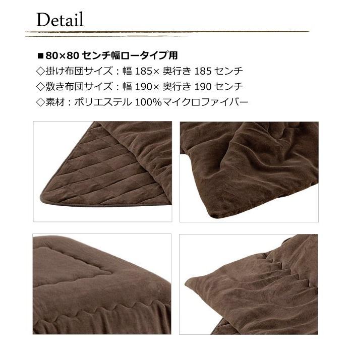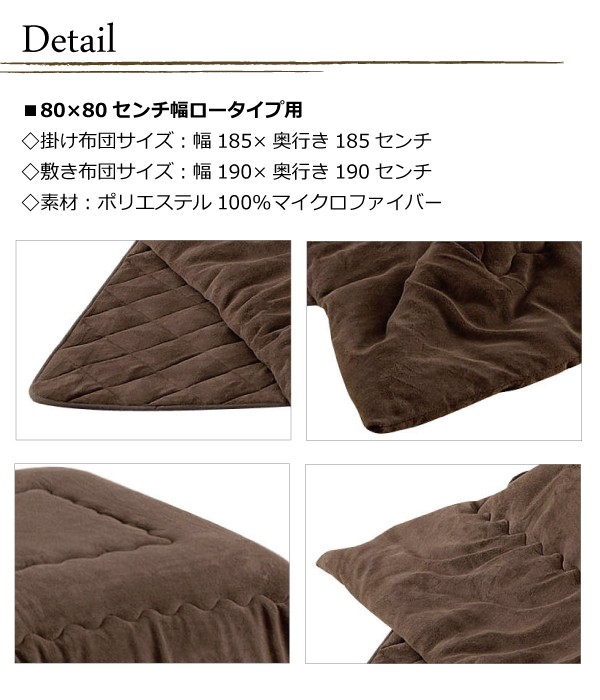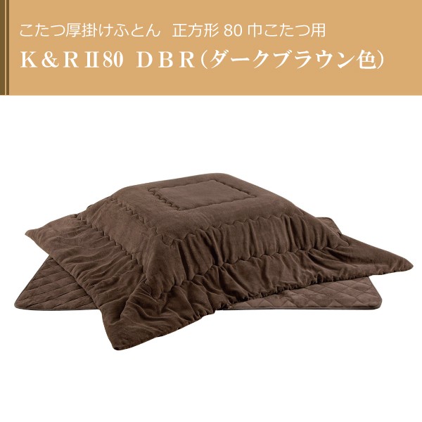 こたつ布団 正方形こたつ厚掛けふとん 正方形80巾こたつ用 K&RII80 DBR(ダークブラウン色)※落ち着いたブラウンのこたつ布団です。シンプルなデザインなので場所を選びません。厚掛けタイプなので真冬でもとても暖かく快適にお過ごしいただけます。■80×80センチ幅ロータイプこたつ用◇掛け布団サイズ:幅185×奥行き185センチ◇敷き布団サイズ:幅190×奥行き190センチ◇素材:ポリエステル100%マイクロファイバー◇このシリーズには「正方形80巾こたつ用」「長方形105〜120巾こたつ用」「長方形150巾こたつ用」「長方形180巾こたつ用」の4タイプがございます。《1日〜2日(土日除く)での発送となります》"} 正方形80巾こたつ用 K&RII80 DBR(ダークブラウン色)