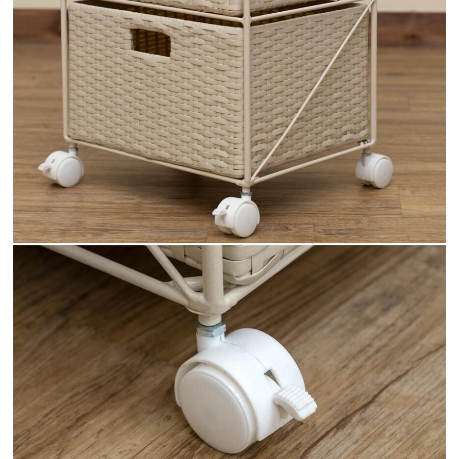 沖縄・離島へは配達できない商品です。軽くて丈夫、さらにお洒落な人工ラタン製の収納チェスト3段。ラタン(籐)の風合いを再現し、耐久性に優れた人工ラタン(ポリエチレン)製の収納チェスト3段です。深底で中身がたっぷり入るカゴが3つあり、最上段もカゴ型なので、入れたものが落ちる心配もありません。3段のカゴは取り出して使えます。(最上段のカゴ型は取り外しできません)。キャスター付きで手軽に動かすことができます。前側2個は、その場で固定できるストッパー付です。W350xD300xH740mm(各キャスター含む)。かごサイズ:約W320xD260xH185mm(内寸:W295xD235xH175mm)。本体重量:5.7kg。組立式(約10分前後/付属スパナにてキャスター取付のみ)。素材:フレーム:スチール(エポキシ粉体塗装)。かご:人工ラタン(PE、ポリエチレン)。キャスター4個付(内ストッパー付2個)"}