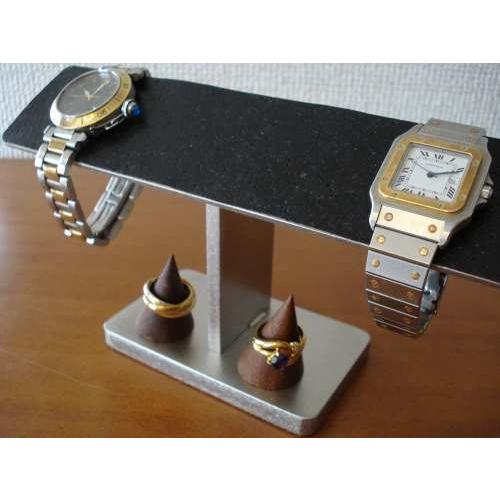 サイズ:長さ22cm、奥行き5cm、高さ9cm材質 ステンレス コルクシート、指輪スタンド(1) ステンレスの色はシルバー色です。(2) ヘアーライン、サテン仕上げ加工でとても綺麗です。(3) パイプにはコルクシートを貼ってあり腕時計は傷つきません。(4) コルクシートにはどんな文字盤が重い腕時計でも滑ってずり落ちない工夫をしていますのでご安心ください。"}