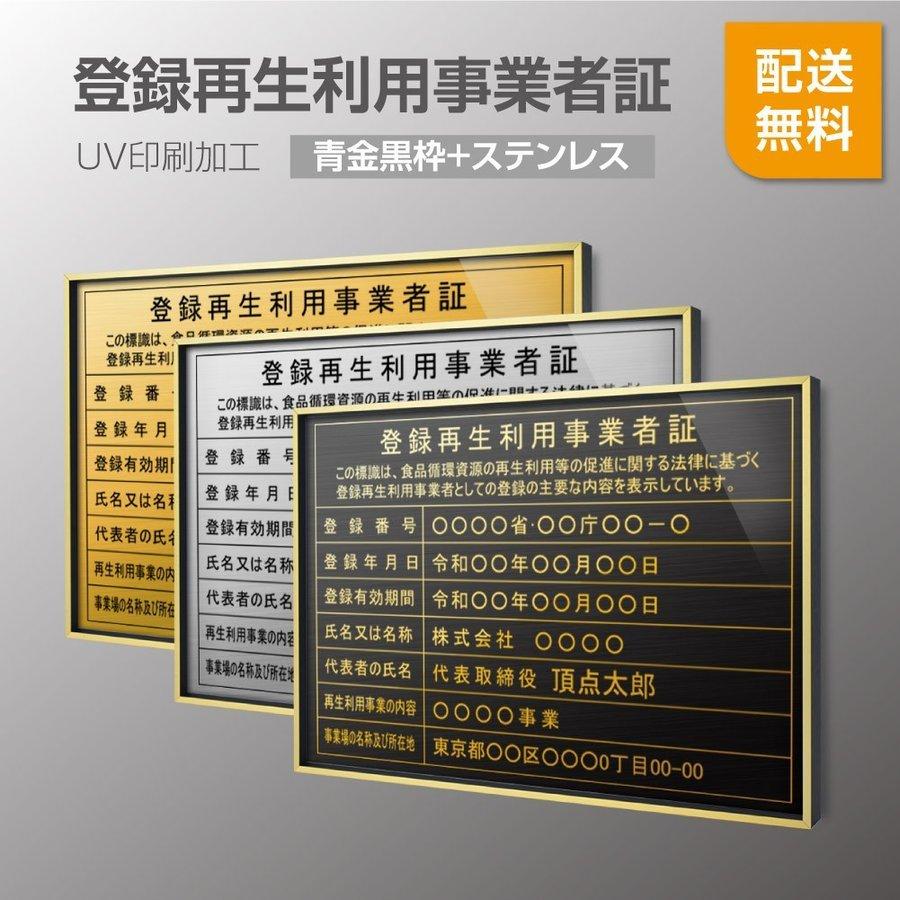 登録再生利用事業者証 選べる額の色 ステンレスカラー 書体種類 520×370mm uv印刷 撥水加工 錆びない 法定サイズ 短納期(l0736-trkss)