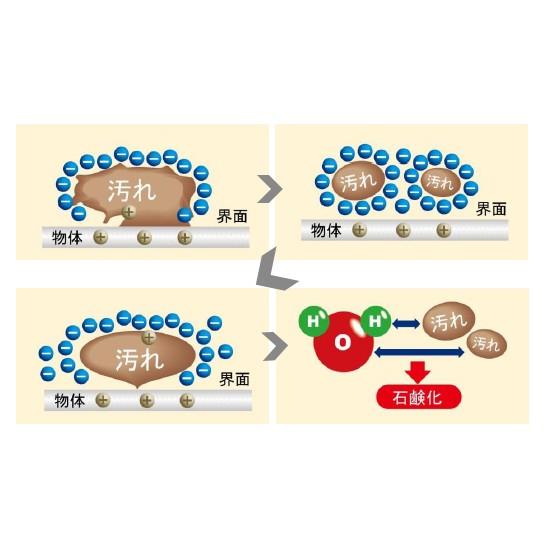 マイナス.イオンに取り囲まれた汚れは小さく分離され油汚れを乳化(エマルジョン)させます。(3) 剥離・分散