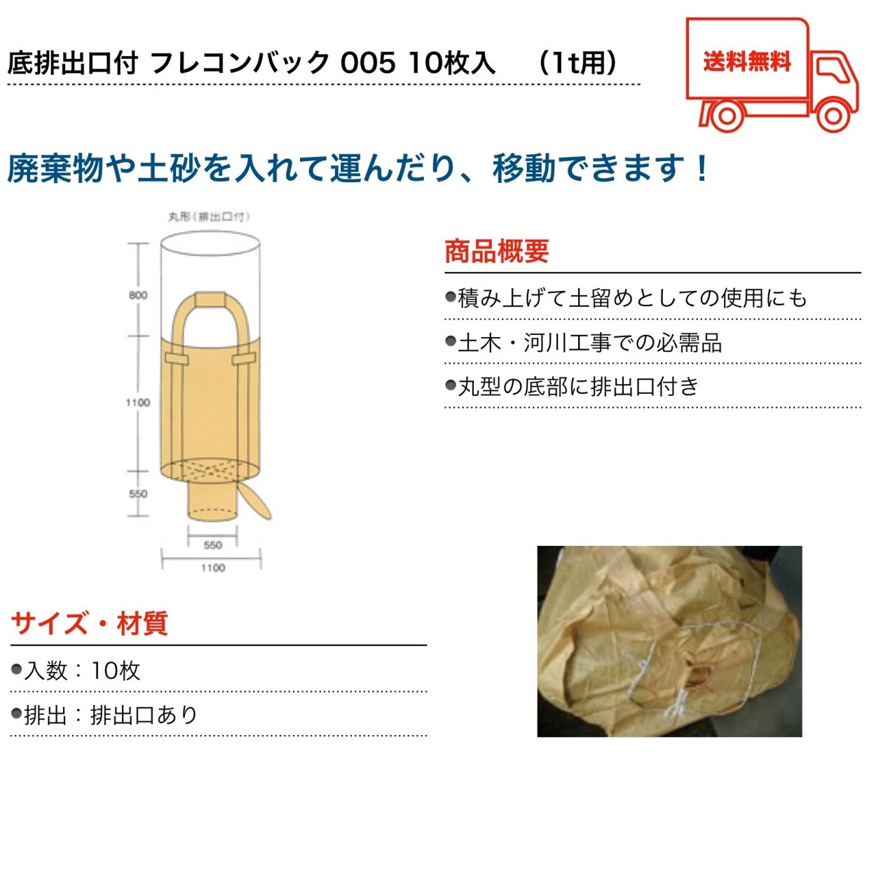 フレコンバッグ 排出口 排出 サイズ 005 土のう袋 土嚢袋 土留め 防災グッズ 防災用品 フレコン フレコンバック 工事現場 災害対策 浸水