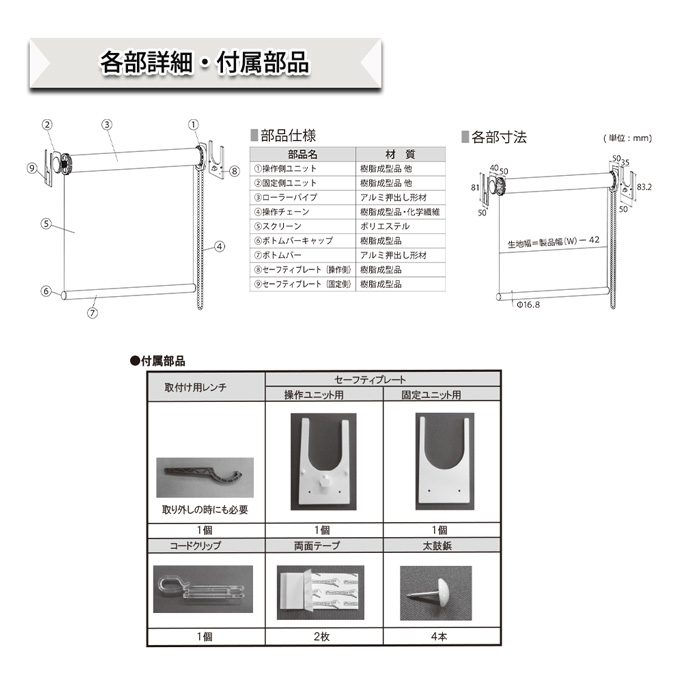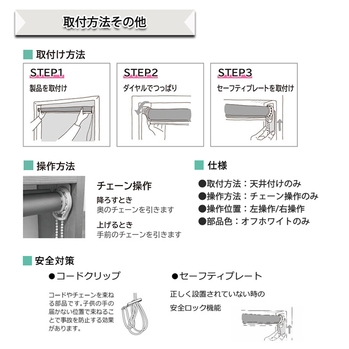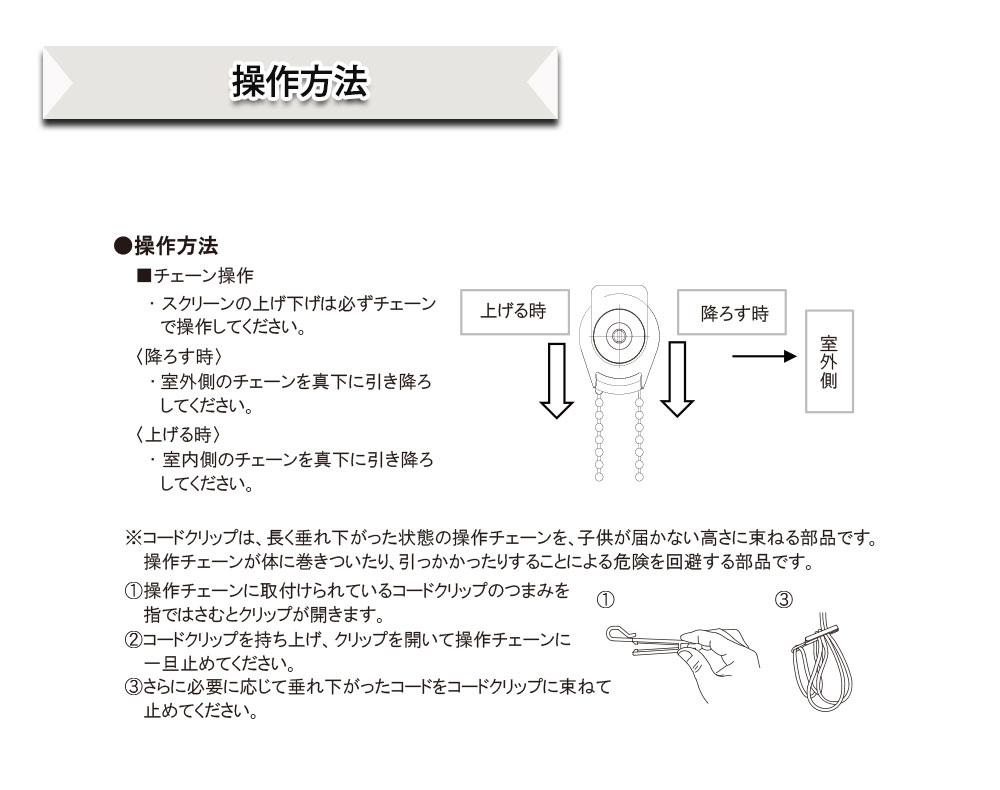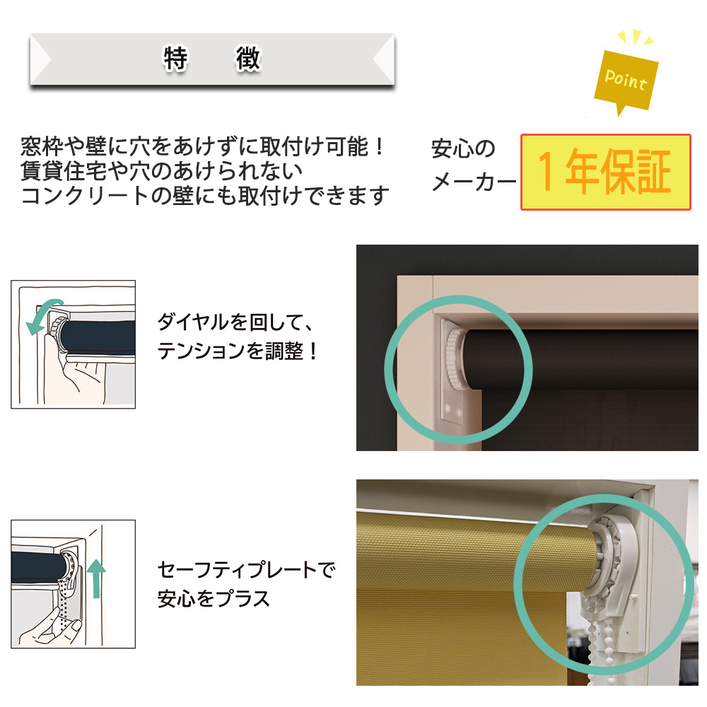 ……商品詳細……〇発注サイズ 幅・高さ共に小数点第一位までご指定ください (例) 幅 59.9cm 高さ76.2cm〇仕様・ ダイヤルを回してテンションを調整する突っ張り式・天井付けのみ・チェーン操作(左/右)・部品色:オフホワイトのみ〇素材 スクリーン(生地):ポリエステル ボトムバー:アルミ押出し型材 その他 安全対策(コードクリップ、セーフティプレート)〇付属品 取付け用レンチ セーフティプレート コードクリップ 両面テープ 太鼓鋲〇ご注意 ※メーカー直送品のためご注文後の変更・キャンセルはお受けできませんのでご注意ください。 ※メーカー直送品のためきでのお支払方法はできません。〇送料 ※離島への発送は別途送料がかかります。(こちらで加算させて頂きます)〇メーカー保証について お買い上げ後1年以内に、正常な使用状態において、万一故障した場合は無償で修理いたします。詳細は商品同梱の取扱説明書をご覧ください。