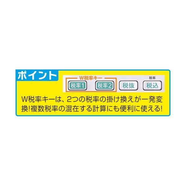 機能:早打ち対応、計算状態表示、総合計(GT)、W税計算、マルチ%、四則定数計算、概数計算、桁下げ、切捨て・四捨五入、アドモード計算、00キー、3桁位取り表示、オートパワーオフ