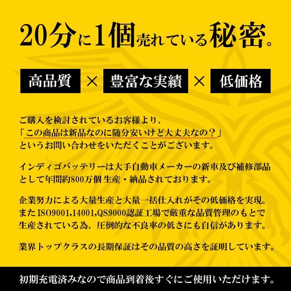 ■適合車両・車名:TOYOTA ハイエースワゴン・型式:CBA-TRH219W・年式:H16/8〜・エンジン:ガソリン車・排気量:2700cc・備考:寒冷地仕様車除く・備考:充電制御車・備考:4WD※上記適合条件が全て一致していても車輌の製造日や仕様により本品が適合しない場合がある為、使用中のバッテリーと下記商品情報(寸法、端子)をお確かめの上ご注文ください。■商品情報・分類:自動車用バッテリー/カーバッテリー・メーカー:インディゴ・品名:INDIGO PREMIUM・サイズ:115D26R・タイプ:密閉型(補水不要のメンテナンスフリー)・保証:3年または10万km・備考:充電制御車対応・長辺:260mm・短辺:170mm・高さ:220mm・重量:18.1kg・電圧:12V・時間率:66/5HR・CCA:650・端子:R(太端子)・互換サイズ:55D26R/60D26R/65D26R/70D26R/75D26R/80D26R/85D26R/90D26R/95D26R/100D26R/105D26R/110D26Rなど・年間800万個の販売実績・業界トップクラスの長期保証・状態が一目で分かる点検用インジケータ付き・初期充電済なので到着後すぐに使用可能インディゴプレミアムバッテリーは高密度活物質を採用。