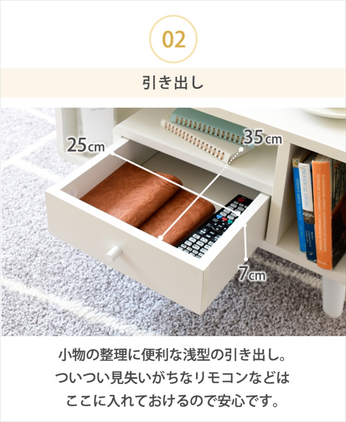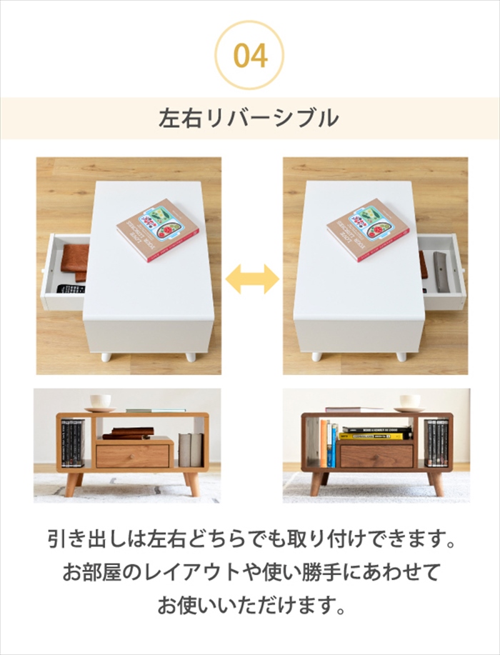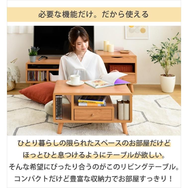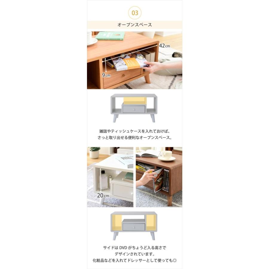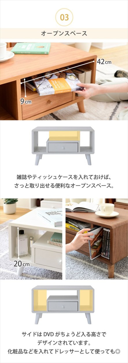 | 収納するものから設計されたデザインだから、コンパクトでも機能的。 リビングテーブルとしての機能だけでなく、DVDやティッシュ、雑誌が収納できるオープン部、リモコンなどを収納できる引き出し付き。 丸みのある北欧風のデザインはとてもおしゃれで、ひとり暮らしのお部屋にもぴったりです。 |