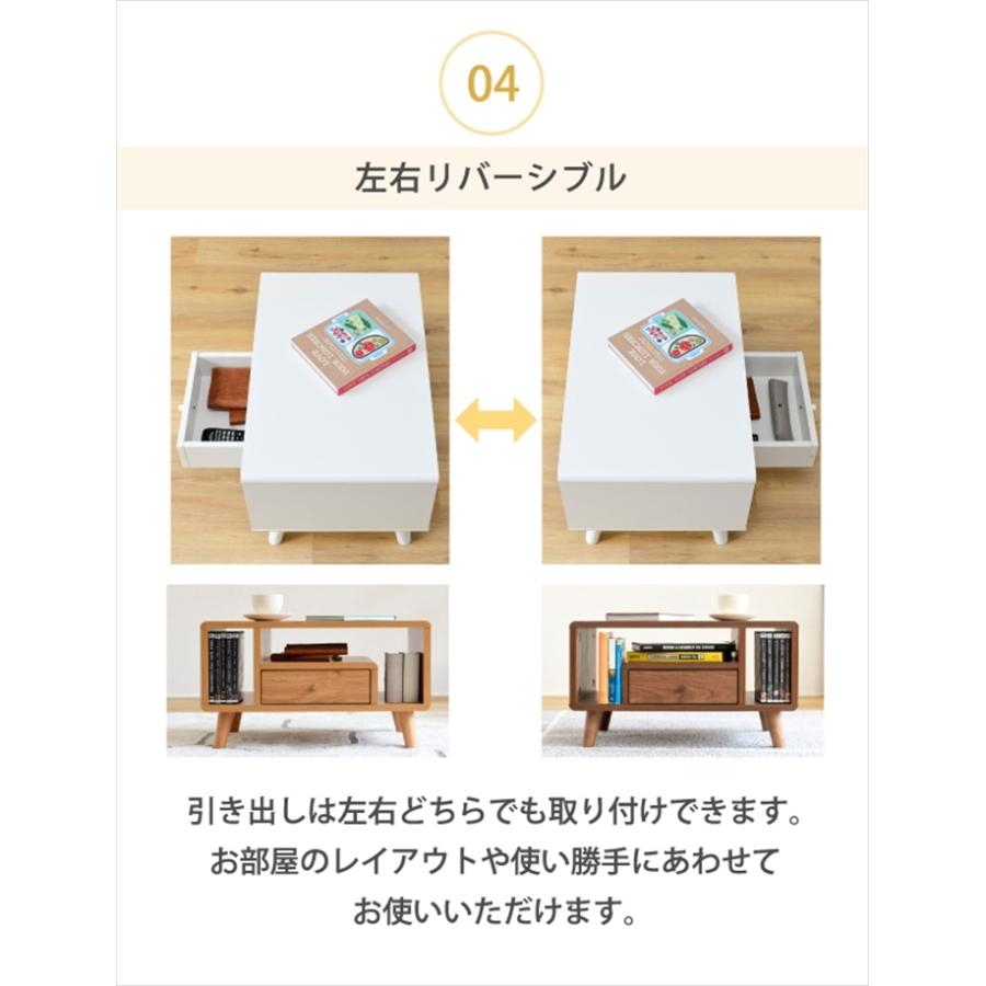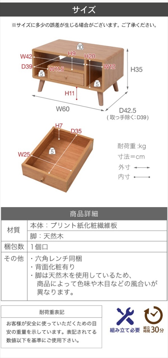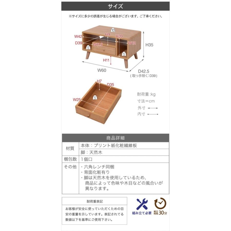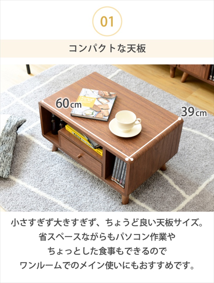 収納するものから設計されたデザインだから、コンパクトでも機能的。リビングテーブルとしての機能だけでなく、DVDやティッシュ、雑誌が収納できるオープン部、リモコンなどを収納できる引き出し付き。丸みのある北欧風のデザインはとてもおしゃれで、ひとり暮らしのお部屋にもぴったりです。▼本体サイズ[外寸]約幅60×奥行42.5×高さ35cm▼その他サイズ[内寸](オープン部)約幅12×奥行39×高さ20cm(L字オープン部)約幅42(11.5)×奥行39×高さ9(20)cm(引き出し)約幅25×奥行35×高さ7cm(脚元空間)高さ11cm▼材質[本体]プリント紙化粧繊維板[脚]天然木▼収納量・耐荷重[天板]約10kg以下[オープン部]各約5kg以下[引き出し]約5kg以下▼備考 ・六角レンチ同梱 ・背面化粧有り ・脚は天然木を使用しているため、商品によって色味や木目などの風合いが異なります ・脚裏フェルト付き▼生産国マレーシア▼組立時間(目安)(大人2人)お客様組立(30分)▼キーワード北欧 小さめ 白 一人暮らし 北欧モダン ローテーブル 収納あり 四角 小さい ウォールナット 角が丸い 木 曲線 北欧風 角丸 センターテーブル 長方形 天然木 ティッシュ収納
