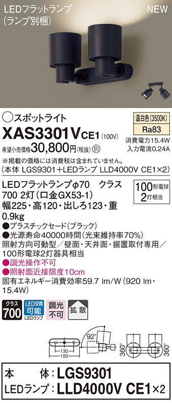XAS3301V CE1【本体】LGS9301【LEDランプ】LLD4000V CE1光源◆LEDフラットランプφ70 クラス700 2灯(口金GX53-1) ◆色温度:3500 K ◆光源寿命40000時間(光束維持率70%)寸法・質量◆幅:225 mm ◆高:120 mm ◆出しろ:123 mm◆質量:0.9 kg仕様◆器具光束:920 lm ◆電圧:100 V ◆消費電力:15.4 W ◆消費効率:59.7 lm/W◆【プラスチックセード】ブラック◆天井直付型・壁直付型・据置取付型◆Ra83◆照射方向可動型◆可動範囲上下92度◆回転方向360度◆壁面・天井面・据置取付専用◆100形電球2灯器具相当◆入力電流(100V時):0.24 A◆調光操作◆照射面近接限度10cm