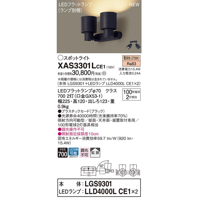 パナソニック XAS3301L CE1 天井・壁直付型・据置取付型 LED 電球色 スポットライト 拡散型 白熱電球100形2灯相当 本体+LEDランプ
