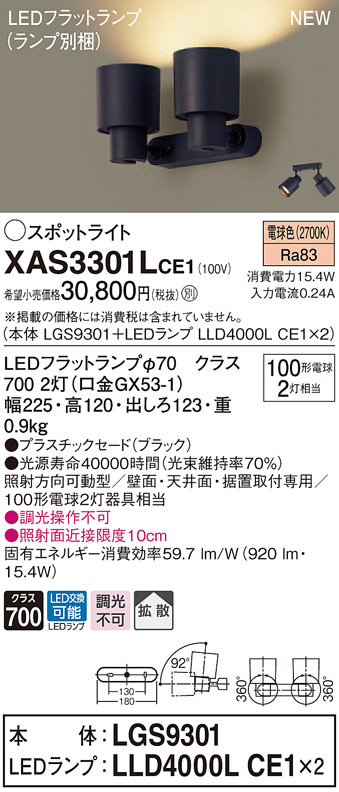 XAS3301L CE1【本体】LGS9301【LEDランプ】LLD4000L CE1光源◆LEDフラットランプφ70 クラス700 2灯(口金GX53-1) ◆色温度:2700 K ◆光源寿命40000時間(光束維持率70%)寸法・質量◆幅:225 mm ◆高:120 mm ◆出しろ:123 mm◆質量:0.9 kg仕様◆器具光束:920 lm ◆電圧:100 V ◆消費電力:15.4 W ◆消費効率:59.7 lm/W◆【プラスチックセード】ブラック◆天井直付型・壁直付型・据置取付型◆Ra83◆照射方向可動型◆可動範囲上下92度◆回転方向360度◆壁面・天井面・据置取付専用◆100形電球2灯器具相当◆入力電流(100V時):0.24 A◆調光操作◆照射面近接限度10cm