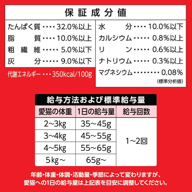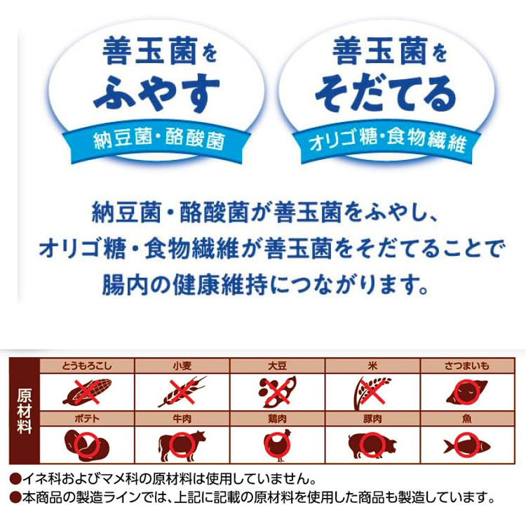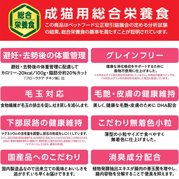 | オリゴ糖・食物繊維が善玉菌をそだて、納豆菌・酪酸菌が善玉菌をふやすことで腸内の健康を維持します。 健康な消化吸収をサポートするためにグレインフリー(穀物不使用)に仕上げました。 避妊・去勢後の太りやすい体質をサポートするためにカロリー−20Kcal/100g・脂肪分約20%カット(フローラケアチキン味比)。 下部尿路の健康維持に低マグネシウム設計(標準分析値0.08%)、毛玉に配慮して食物繊維、美しく健康な毛艶・皮膚のためにフィッシュオイル(DHA)、ニオイに配慮して植物発酵抽出エキスを配合しました。 ※イネ科およびマメ科の原材料は使用していません。 |