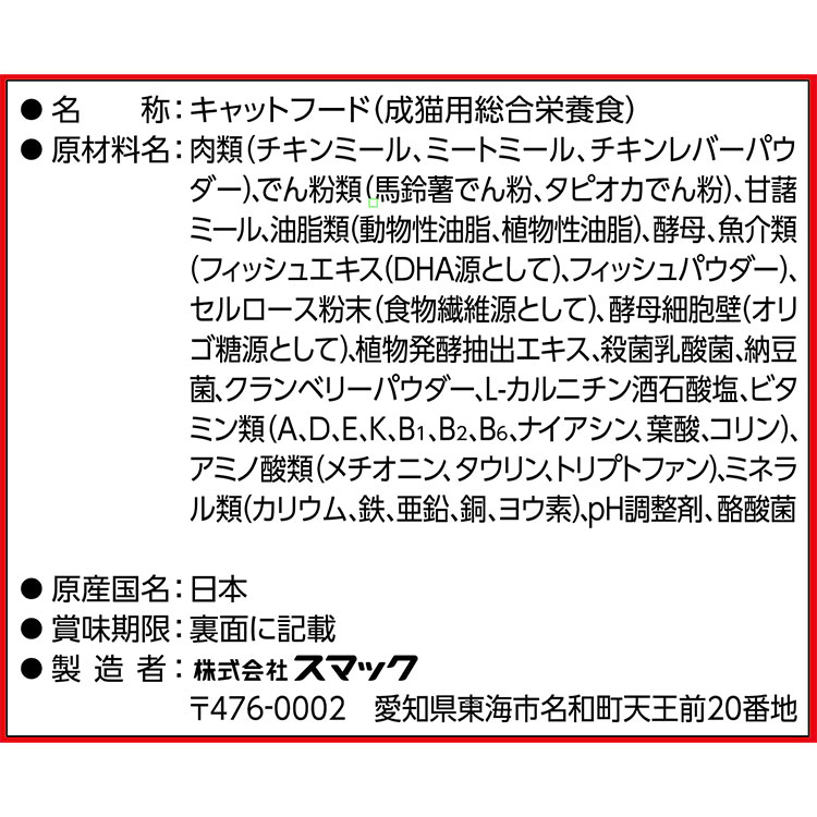 オリゴ糖・食物繊維が善玉菌をそだて、納豆菌・酪酸菌が善玉菌をふやすことで腸内の健康を維持健康な消化吸収をサポートするためにグレインフリー(穀物不使用)に仕上げました避妊・去勢後の太りやすい体質をサポートするために脂肪分約20%カット下部尿路の健康維持に低マグネシウム設計、毛玉に配慮して食物繊維、美しく健康な毛艶・皮膚のためにフィッシュオイル(DHA)、ニオイに配慮して植物発酵抽出エキスを配合●対象:成猫用(1歳から)/全猫種用/避妊猫用・去勢猫用●内容量:720g(120g×6)×12個●エネルギー:350kcal/100g●原産地:日本●メーカー:スマック●JANコード:4970022024581●キーワード成猫用 高齢猫用 シニア猫用 老猫用 全猫種用 成猫用総合栄養食 乳酸菌配合 超小粒 F.L.U.T.に配慮 毛玉対応 消臭成分配合 国産品 小分けパック 正規品 無着色 毛玉ケア ヘアボールケア 下部尿路の健康維持用 FLUTの健康ケア トッピング 腸内の健康維持 避妊猫用 去勢猫用 猫フード 猫用フード 猫ごはん えさ エサ 餌 カリカリ フィッシュエキス サカナ 魚 鳥肉 鳥肉 チキン イネ科不使用 マメ科不使用 脂肪分カット ダイエット 体重管理フローラケアCAT 避妊・去勢猫用チキン味 720g