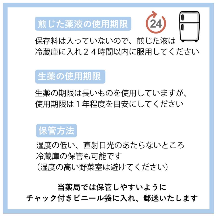 (4)煎じ液は腐敗しやすいので、冷暗所又は冷蔵庫等に保管し、服用時に再加熱して服用してください。