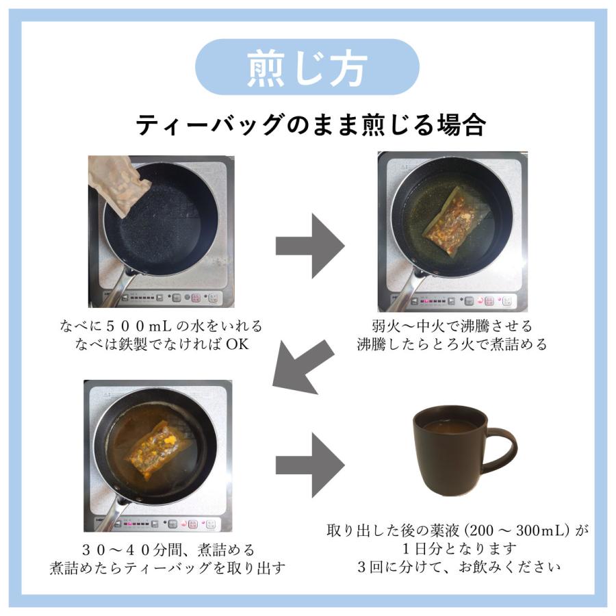 本品1包に、水約500mL を加えて、半量ぐらいまで煎じつめ、煎じかすを除き、煎液を3回に分けて食間に服用してください。