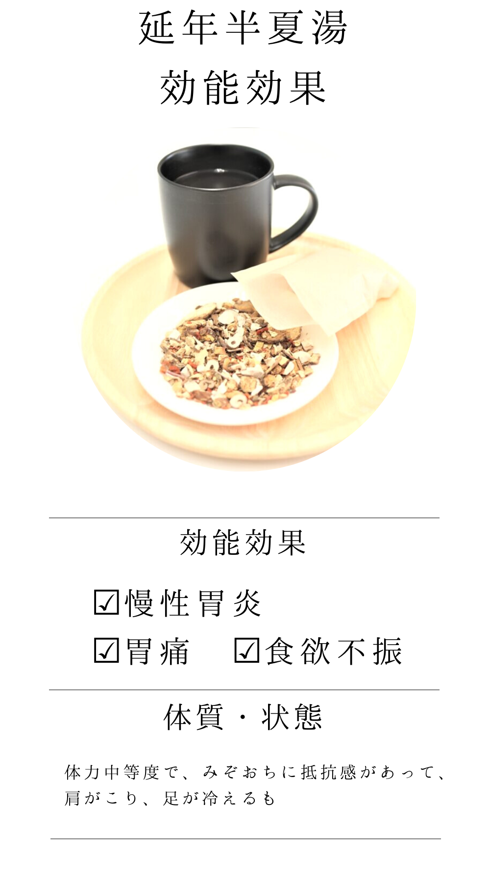 延年半夏湯は、「外台秘要方」を原典とする、体力中等度で、みぞおちに抵抗感があって、肩がこり、足が冷える人の、慢性胃炎、胃痛、食欲不振に用いられる漢方薬です。