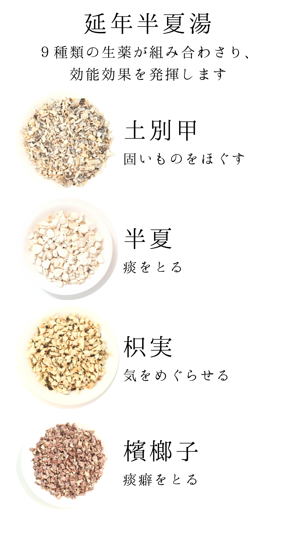 ハンゲ5.0g,サイコ3.0g,ドベッコウ3.0g,キキョウ3.0g,ビンロウジ3.0g,ニンジン2.0g,ショウキョウ1.0g,キジツ1.0g,ゴシュユ1.0g