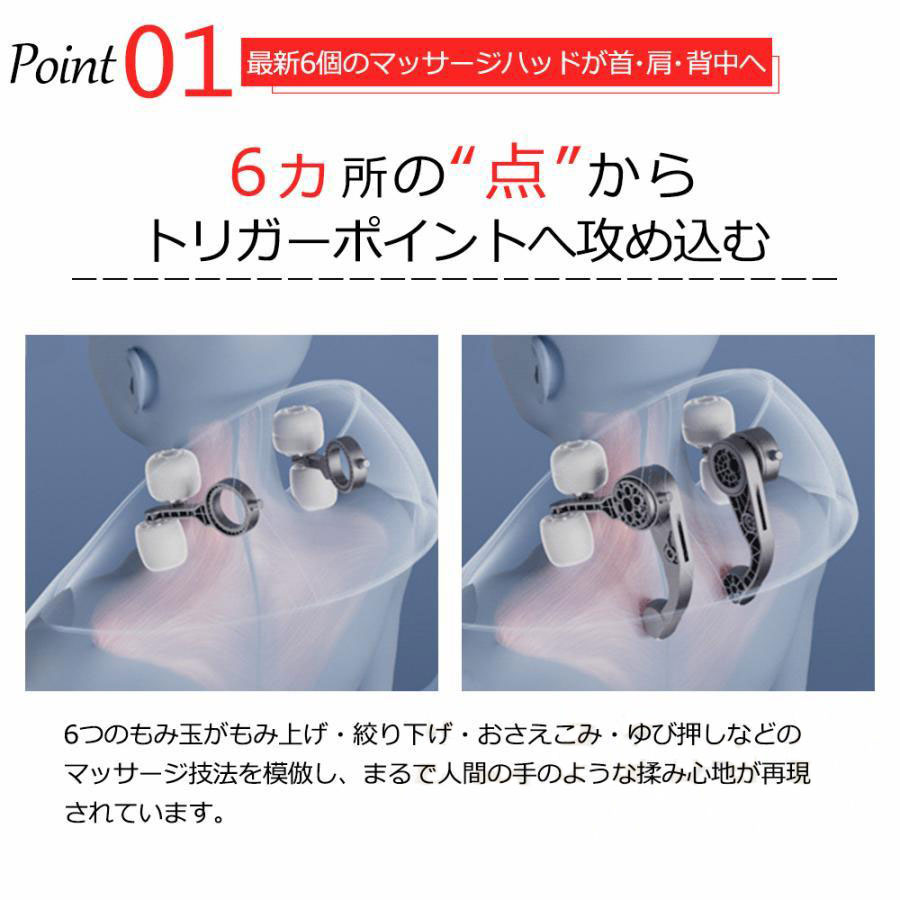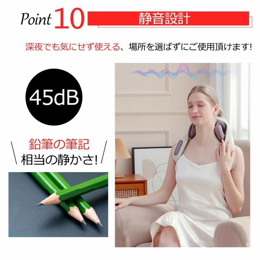 【ヒーター機能搭載】:もみ玉にヒーターが内蔵さており、約44℃に加熱し、あたたかなマッサージをを行ってくれます。【スピード可調整】:異なるマッサージ強度が備えています、お年寄り、女性、学生などに対する自分好きなスピードでマッサージします。【操作簡単&自動タイマー】ワンボタンで誰でも簡単に使えるマッサージです。小型軽量のサイズで、僅か1.18kg、持ち運び便利です。タイマー付き、約10分使用後で自動停止し、過熱や使いすぎる心配もありません。いつでも自宅やオフィスなどの場所で体の深部まで届く快適なマッサージを楽しめます。【プレゼントに最適】自分用としてはもちろん、ご家族やお友達、大切な方へのプレゼントにもぴったりマッサージピローです。お誕生日、正月、クリスマス、母の日、父の日、敬老の日、など様々なシーンで是非ご活用ください。※ご注意事項※出力電圧5V1AのACアダプターをご利用ください。ACアダプターの極性が合わなければ動作しません。また、故障の原因ともなりますのでご注意ください。製造時期や改良などによって仕様が若干異なる場合がございますので何卒ご了承下さい。