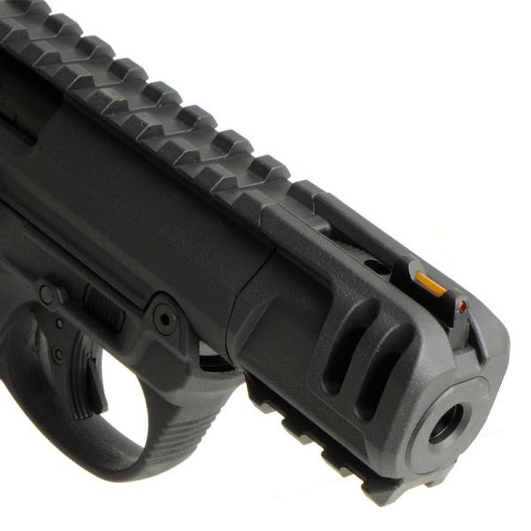アッパーフレームは大きく短縮されたバレルと上下に20mm(ピカティニー規格)レールを備え、