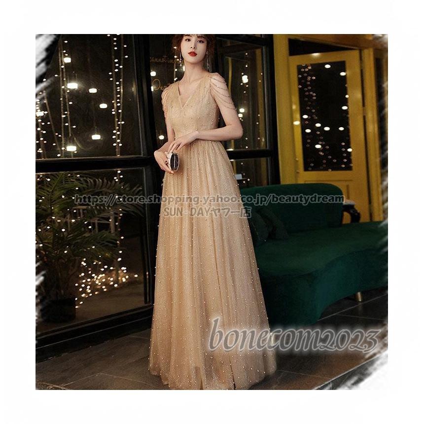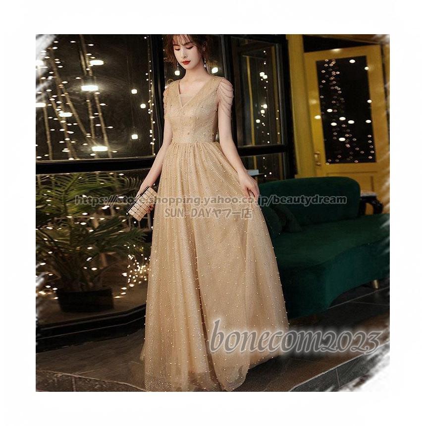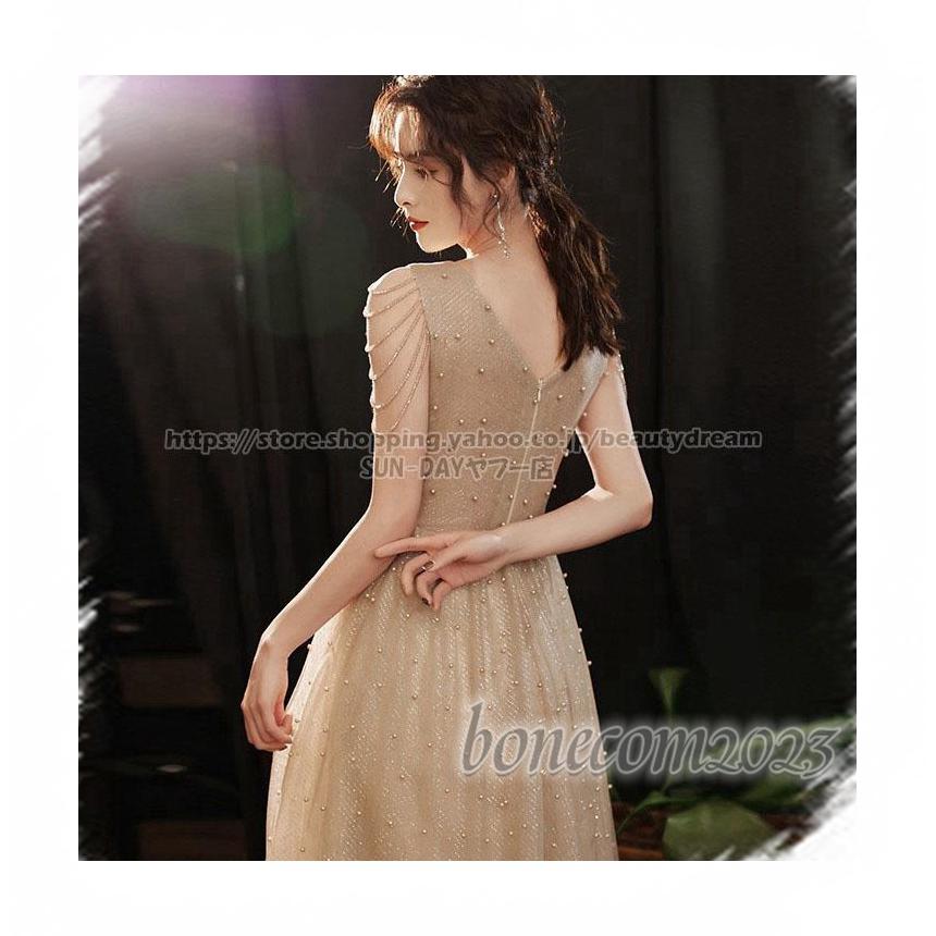 ノースリーブ エンパイア Vネック チュール V襟 可愛いビーズ 前撮り パーティードレス ドレス 細身 ワンピース レディース 花嫁ロングドレスHB